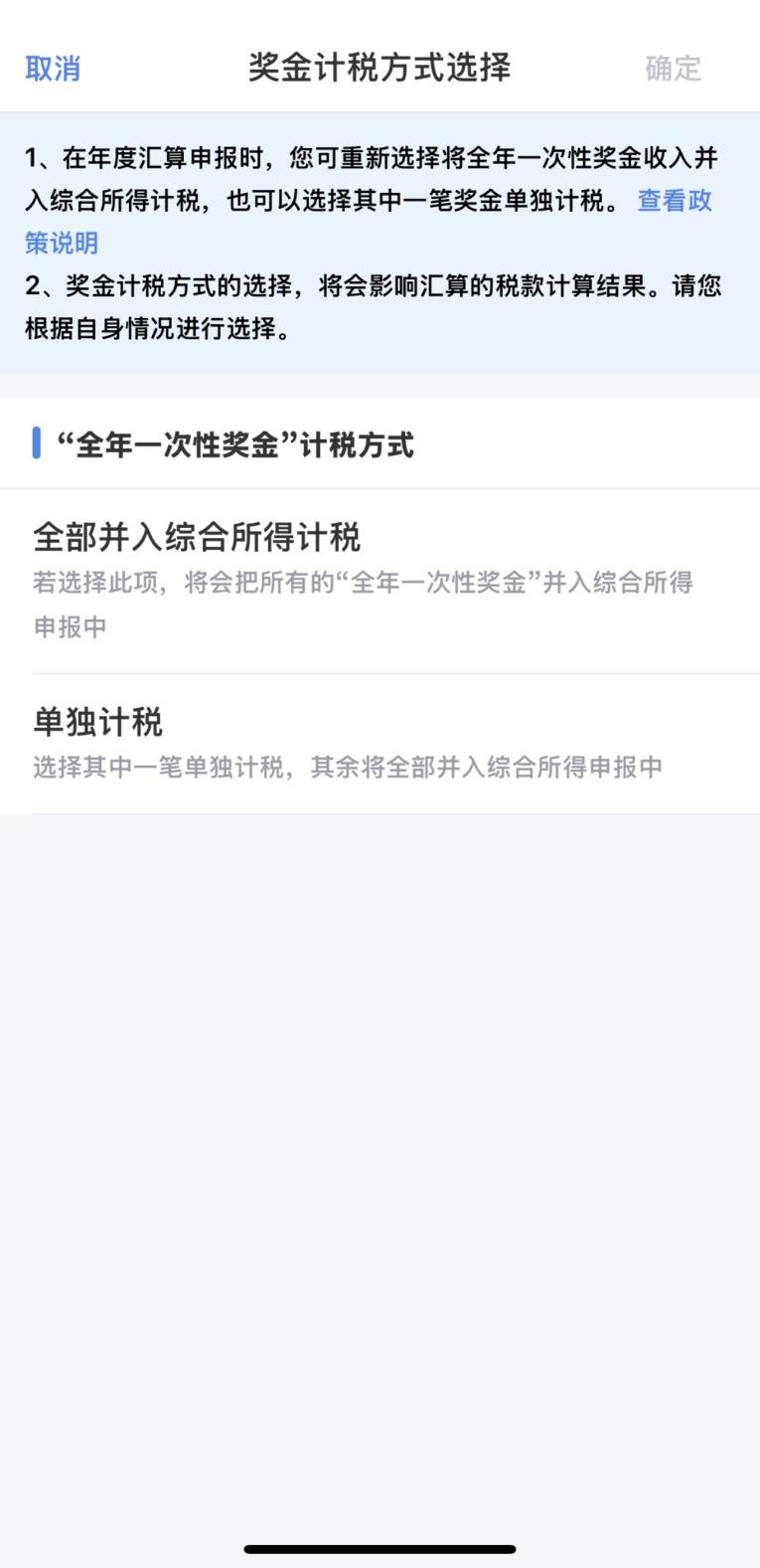 如果我按照全年奖和综合所得合并计税比较划算,但在发全年奖时已经选择单独计税,我该怎么操作才能改为合并计税呢? 答:您可以在办理个税年度汇算时,通过手机个税App实现,具体操作是:在申报表“工资薪金”项下的“奖金计税方式选择”中选择将单独计税的全年一次性奖金并入综合所得。