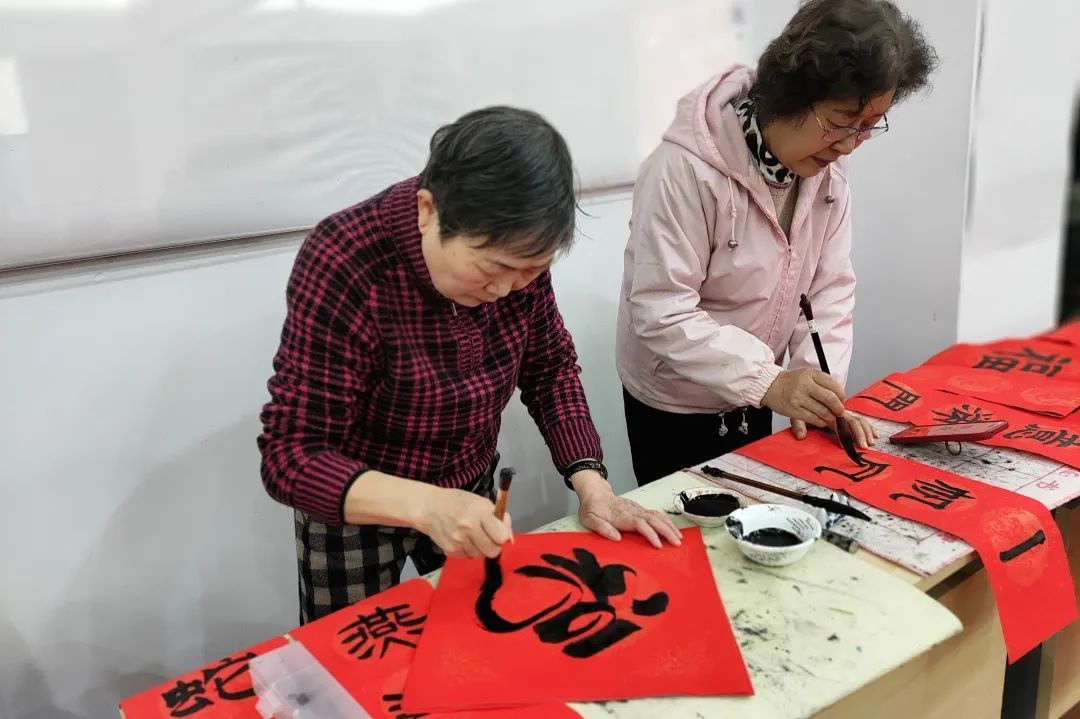 书法创作区则是墨香四溢。社区书法达人们摆开书案,挥毫泼墨,一幅幅寓意吉祥的春联、一个个饱含祝福的“福”字跃然纸上。居民们或在一旁静静欣赏,或积极参与帮忙传递纸张。一位居民手捧着刚写好的春联,高兴地说:“手写的春联才有年味,感谢书法老师们。”