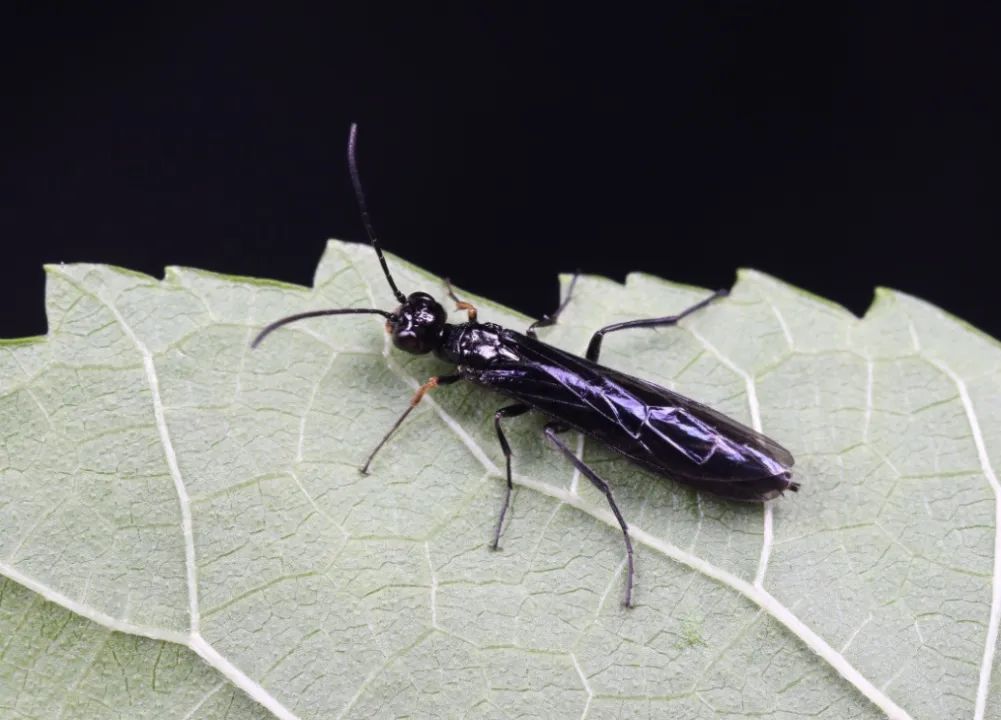 黑翅茎蜂是一种体型细长的蜂,它是本次调查中发现的上海新记录种。据介绍,它属于发生期较短的种类,成虫仅出现在四月末至五月中旬的时间段。专家推测,过去未能在上海地区记录过该物种的原因可能就是因为其发生期较短未能采集。