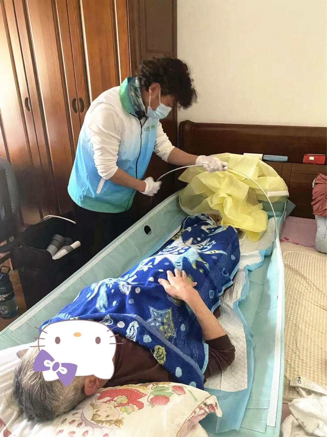 助浴开始,助浴员将仪器一头的加热棒接入纯净水桶,待温度升高,其间助浴员要为吴伯伯测量体温、血压、血氧。确认老人健康状况适宜洗浴后,助浴员在床上展开一面无纺布,放上助浴垫,再铺一层隔水垫,之后将吴伯伯翻过身置于隔水垫上。助浴员在助浴垫上插入环形支架,将定制的洗浴罩覆盖好,形成助浴舱,在开口处还插入了感温仪器。在此过程中助浴员耐心跟老人交流,确保老人情绪放松没有不适。一切就绪,吴伯伯便开始了纳米温浴。