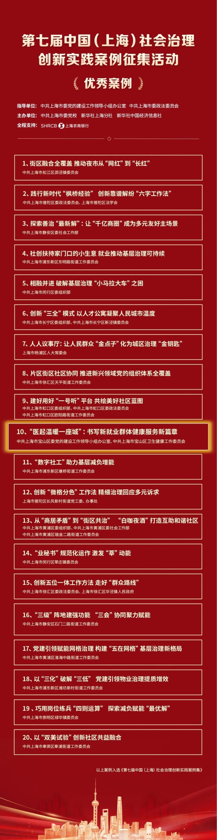 由中共上海市宝山区委党的建设工作领导小组办公室、中共上海市宝山区卫生健康工作委员会联合申报的《“医起温暖一座城”:书写新就业群体健康服务新篇章》荣获优秀案例。
