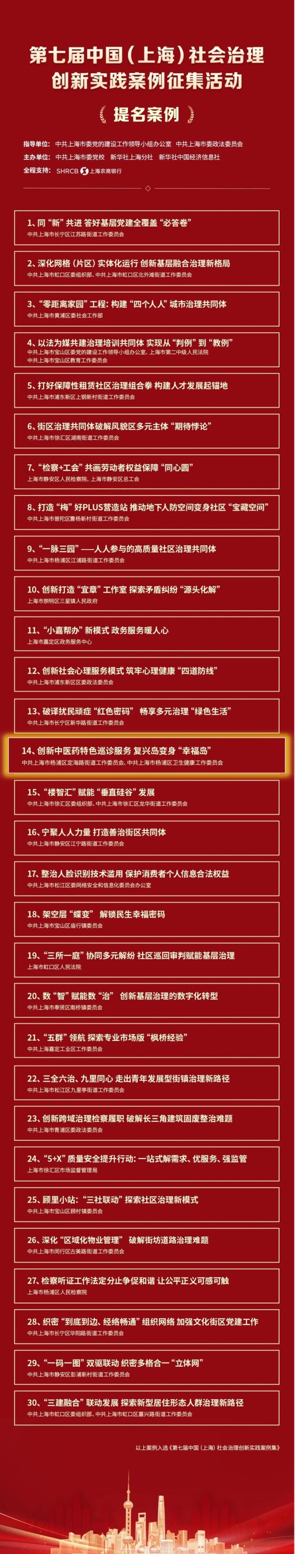 由中共上海市杨浦区定海路街道工作委员会、中共上海市杨浦区卫生健康工作委员会联合申报的《创新中医药特色巡诊服务 复兴岛变身“幸福岛“》荣获提名案例。