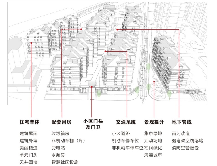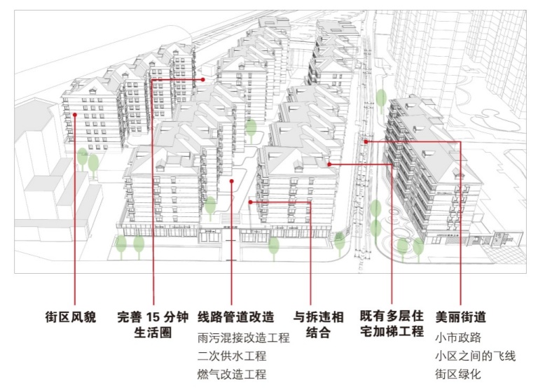 2021年底,徐汇区制定《“三旧”变“三新”老旧小区再提升计划》,聚焦建筑质量差、基础设施薄弱、安全隐患突出的老旧小区,探索实施片区一体化更新。坚持片区规划、系统提升、部门协同。以片区为基本单元,通过部门协同,将片区化修缮与规模化加梯、美丽街区、15分钟生活圈、满意物业等各条线工作紧密结合,“一个片区连着一个片区”开展更新,合力打造出一批各具特色的示范片区。如万体馆周边片区、漕河泾街道金牛片区、凌云街道417街区、康健街道康乐片区。(详情请点击链接)此外,对徐家汇街道漕北大楼、斜土街道香樟苑、枫林街道宛南六村、凌云街道梅陇六村、长桥街道百龙小区等小区进行了精细化修缮。
