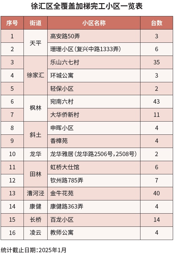 坚持把加装电梯与旧住房修缮相结合,在每个修缮小区设计方案内设置“加梯专篇”,全覆盖实施代为管线移位工程,并通过调整绿化、道路等方式尽可能解决部分门洞原本无法加梯的问题,成街坊、整小区推进加装电梯工作,尽量实现加梯工程与修缮工程同步设计、同步施工,把对居民的影响降到最低。徐汇区2022年完工295台,2023年完工335台,2024年完工333台,连续三年全市加装电梯完工数量位列第一,已打造乐山六七村、金牛花苑、宛南六村等16个加梯全覆盖小区。