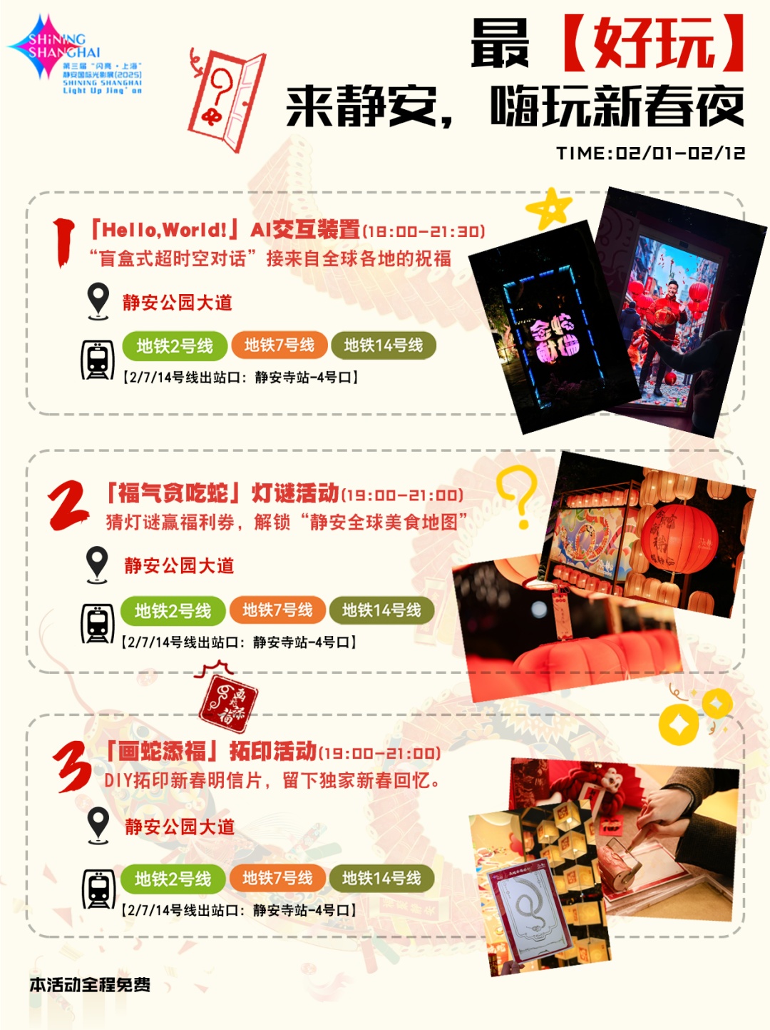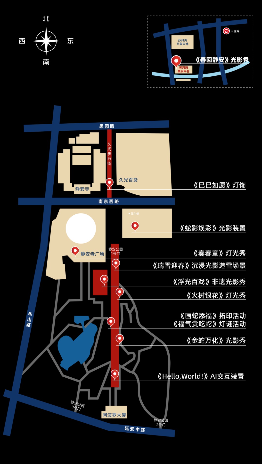 活动以“金蛇献瑞耀静安”为主题,将在2月1日(农历大年初四)至2月12日(农历正月十五)期间,在南京西路商圈与苏河湾商圈同步开展为期12天的系列光影活动。