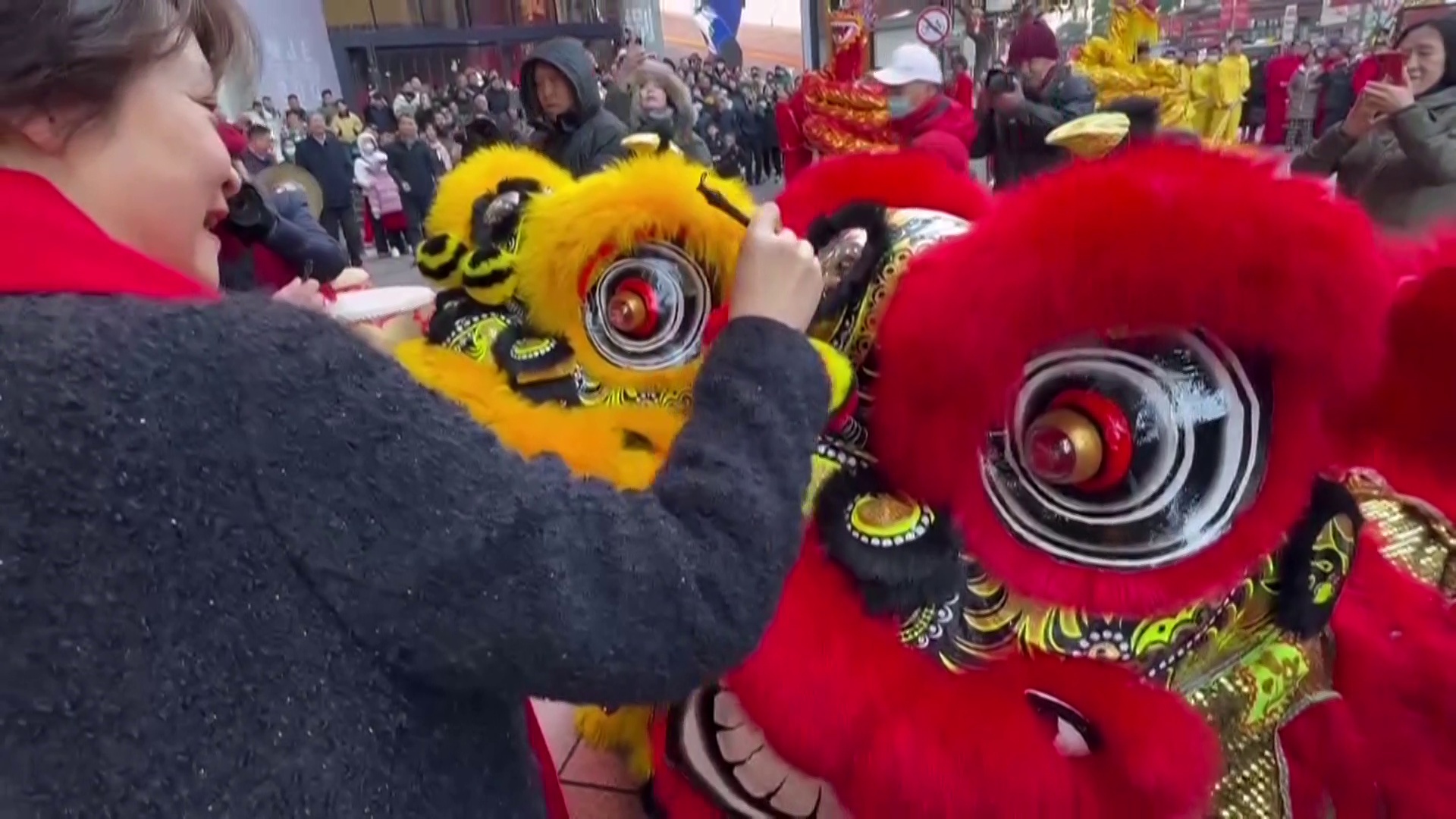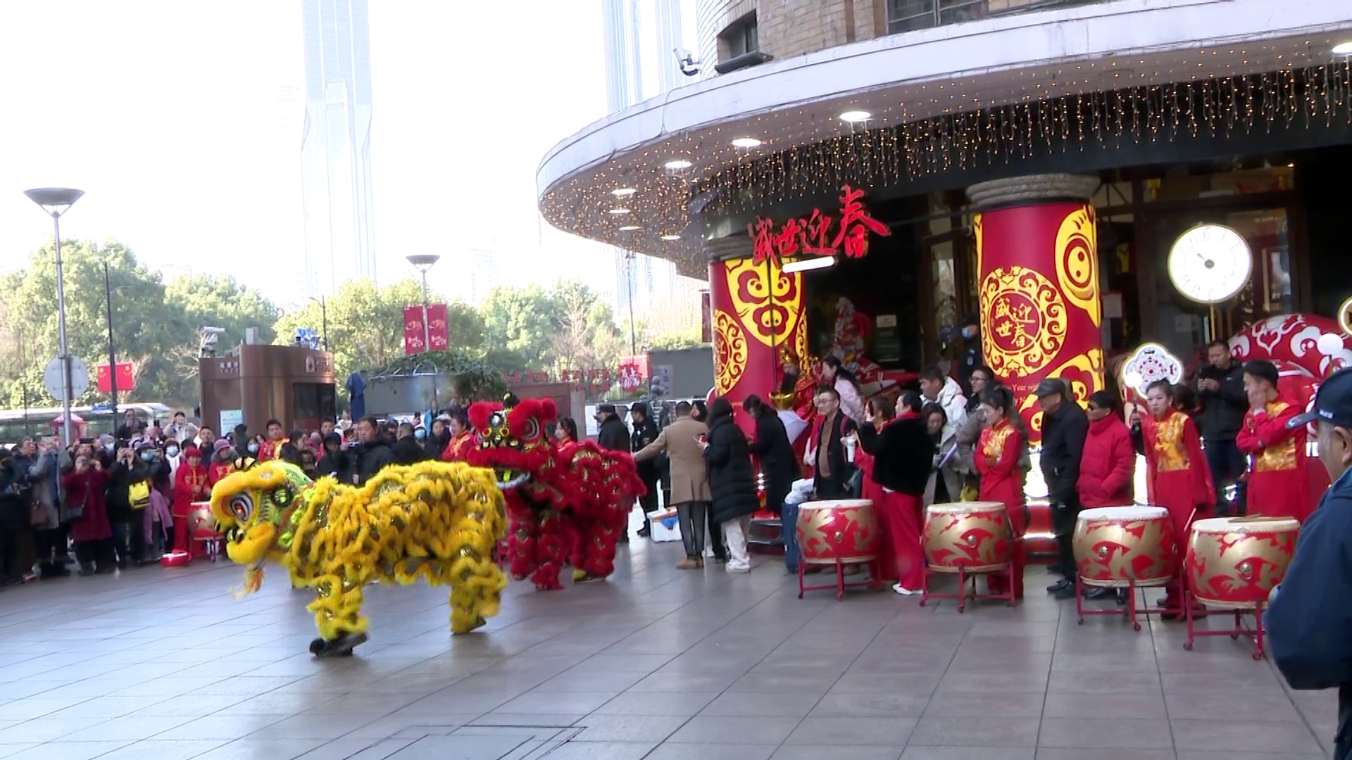 在南京路步行街六合路口的第一百货商业中心门前,热闹非凡的舞龙舞狮表演吸引了众多市民游客驻足。欢乐的锣鼓震天响,调皮的狮子与周边市民游客互动,灵巧的长龙上下腾挪,顿时把过年的气氛展现在人们的面前。市民游客纷纷拿出手机,把这精彩与年味收藏。