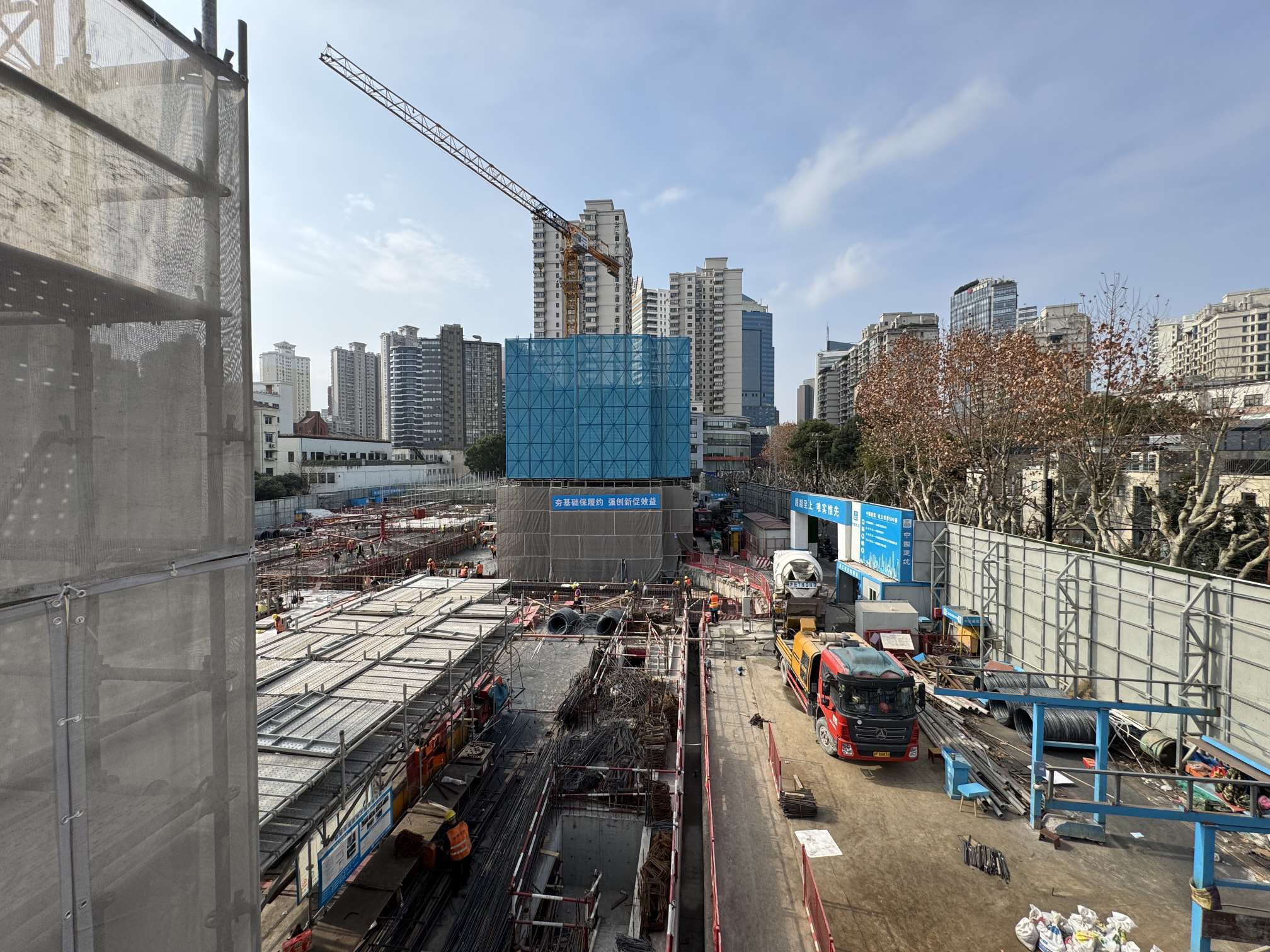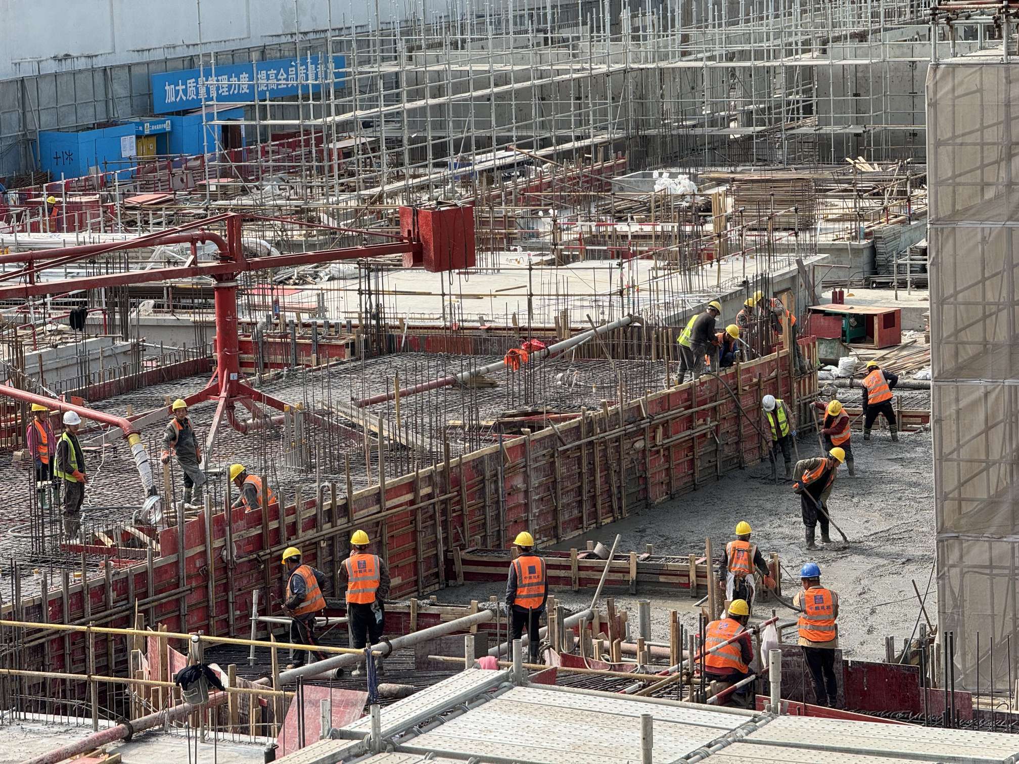 上午,在曹家渡社区项目,只见工地内一片繁忙,建筑工人们正在施工,进行混凝土的浇筑。工地上,几台混凝土搅拌机在滚动不时,还有工人在搬运建筑材料。