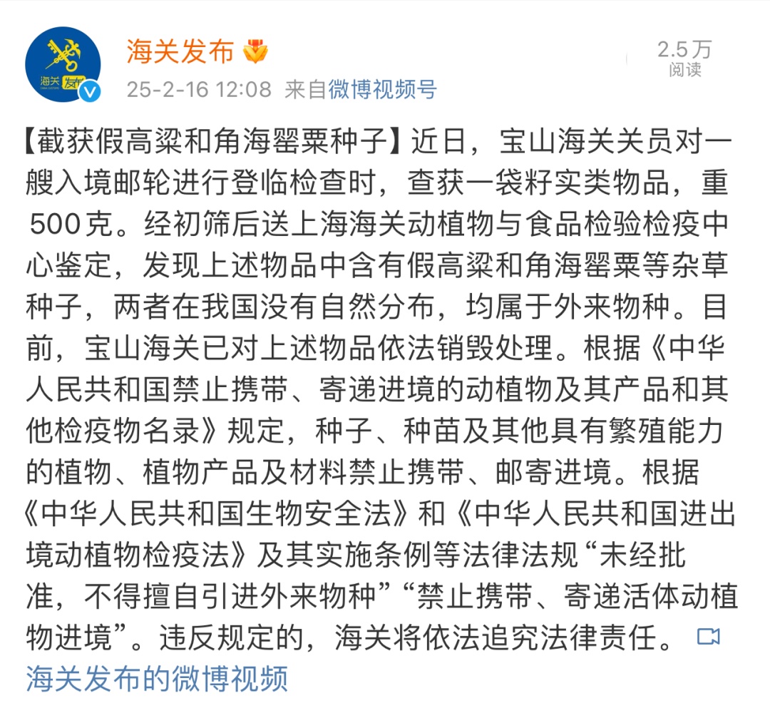 ●11 截获假高粱和角海罂粟种子(央视新闻、海关发布)