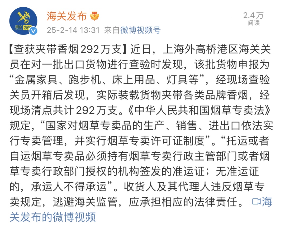 查获夹带香烟292万支