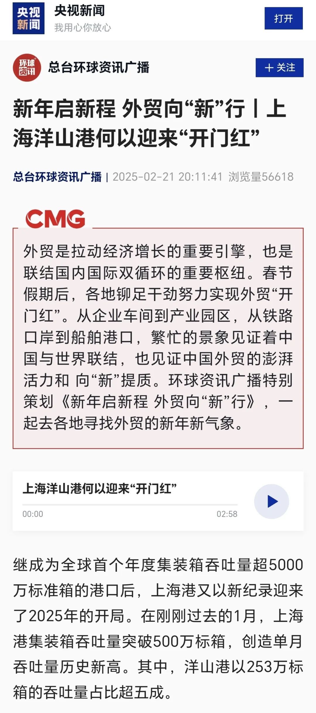 ●01 上海港1月集装箱吞吐量突破500万标箱(央视《新闻直播间》《正点财经》、央视新闻)