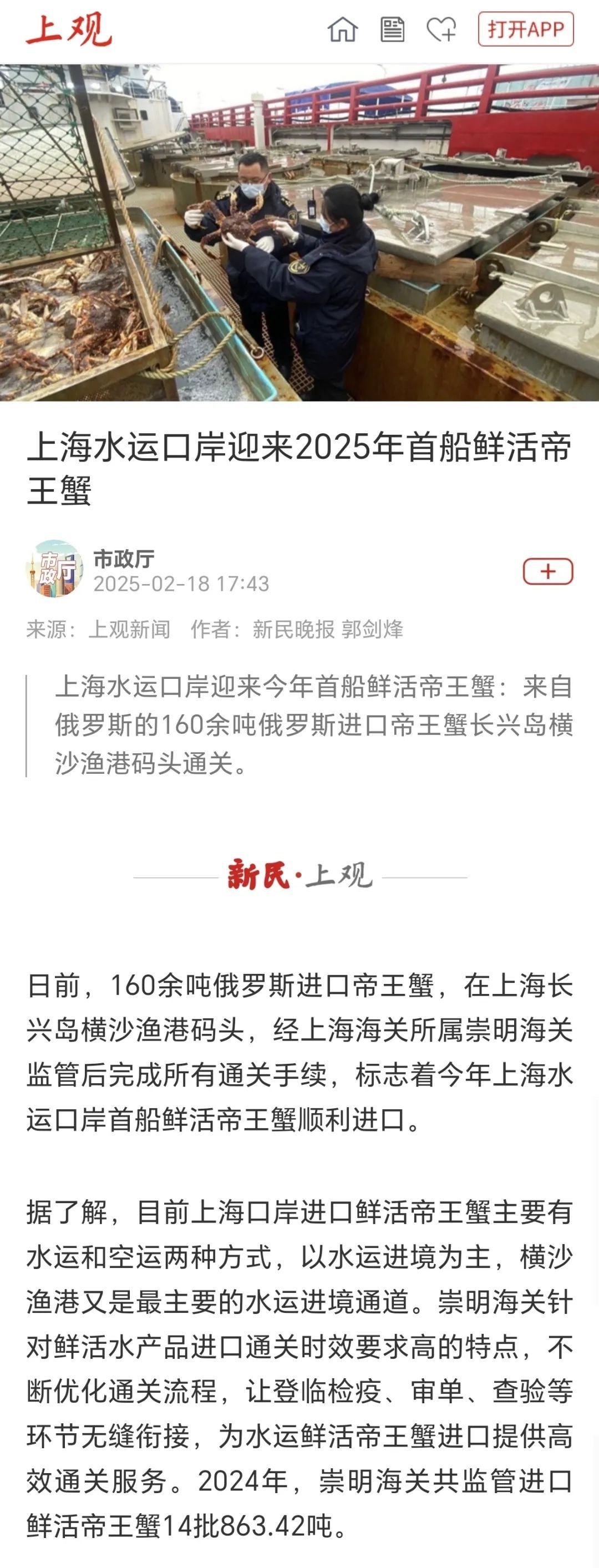 ●06 上海水运口岸迎来2025年首船鲜活帝王蟹(新民上观、上海法治报)