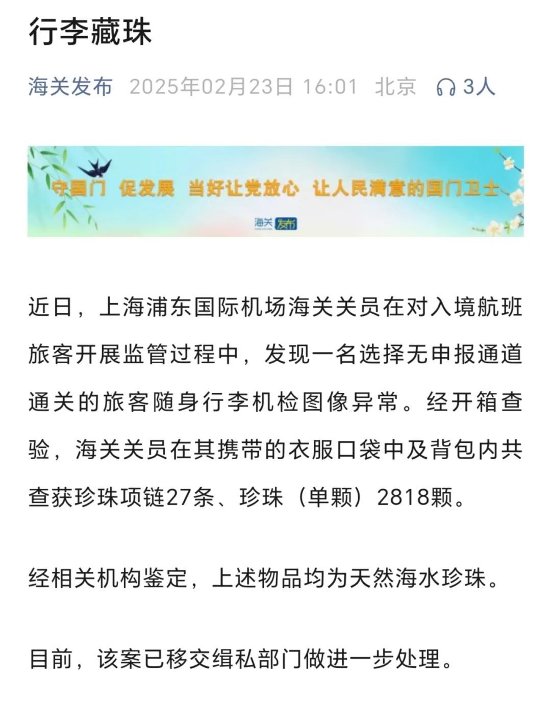 ●12 查获大量未申报珍珠(海关发布)