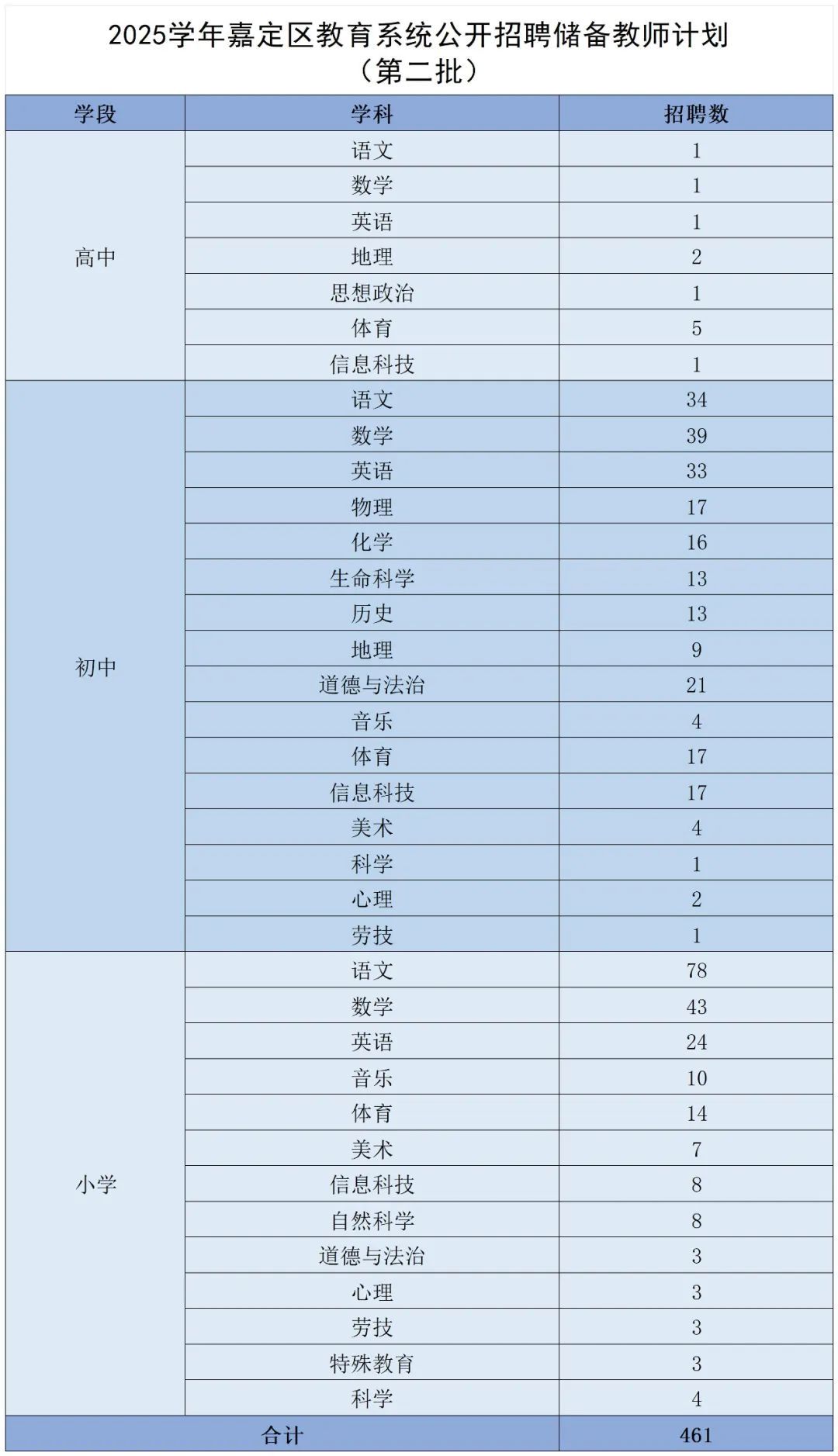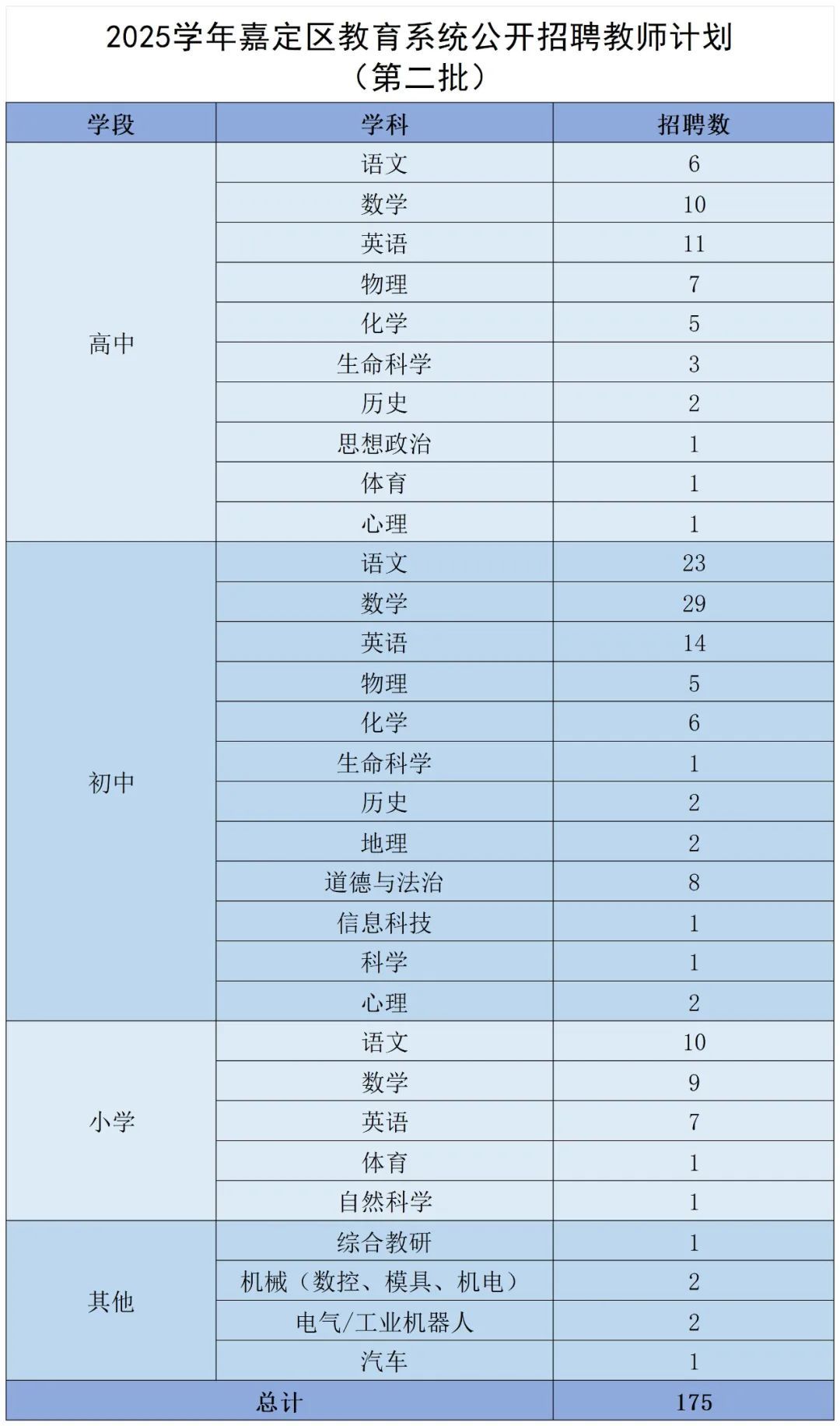 根据上海市人力资源和社会保障局《关于印发<上海市事业单位公开招聘人员办法>的通知》(沪人社规〔2019〕15号)及《上海市嘉定区人民政府关于转发<嘉定区公办中小学(幼儿园)教育人才蓄水池储备教师招聘与管理实施办法(试行)>的通知》(嘉府办发〔2023〕19号)文件精神,为加强师资力量,建设一支高素质、专业化的师资队伍,嘉定区教育系统将面向社会公开招聘教师。2025学年第二批计划招聘事业编制教师175名、储备教师461名。