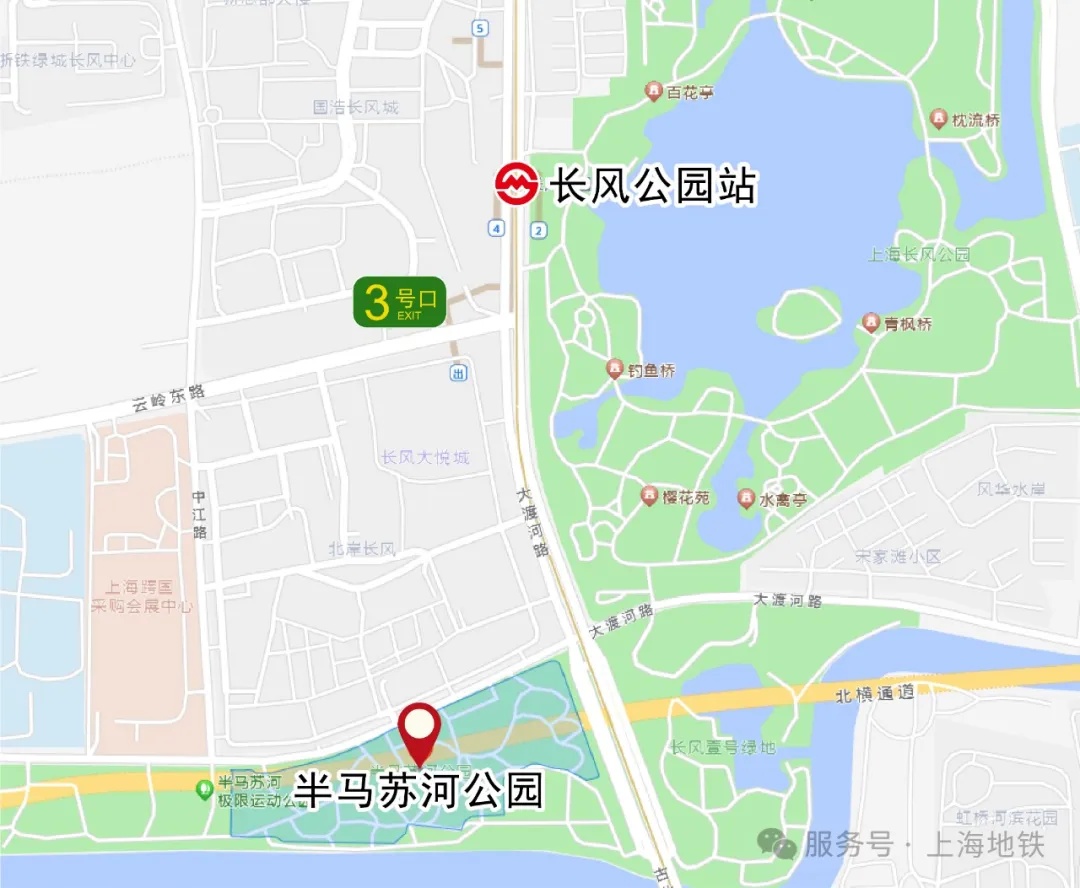 半马苏河公园占地101928平方米,滨河绿道长度1147米,公园位于苏州河北岸,东至大渡河路,西至泸定路,北至光复西路。长风公园游船码头坐落其中,设计充分挖掘场地历史文化,围绕上海试剂总厂保留烟囱打造苏州河音乐广场,布置主题音乐旱喷和烟囱夜景灯光秀,塑造长风地区超级地标场所。