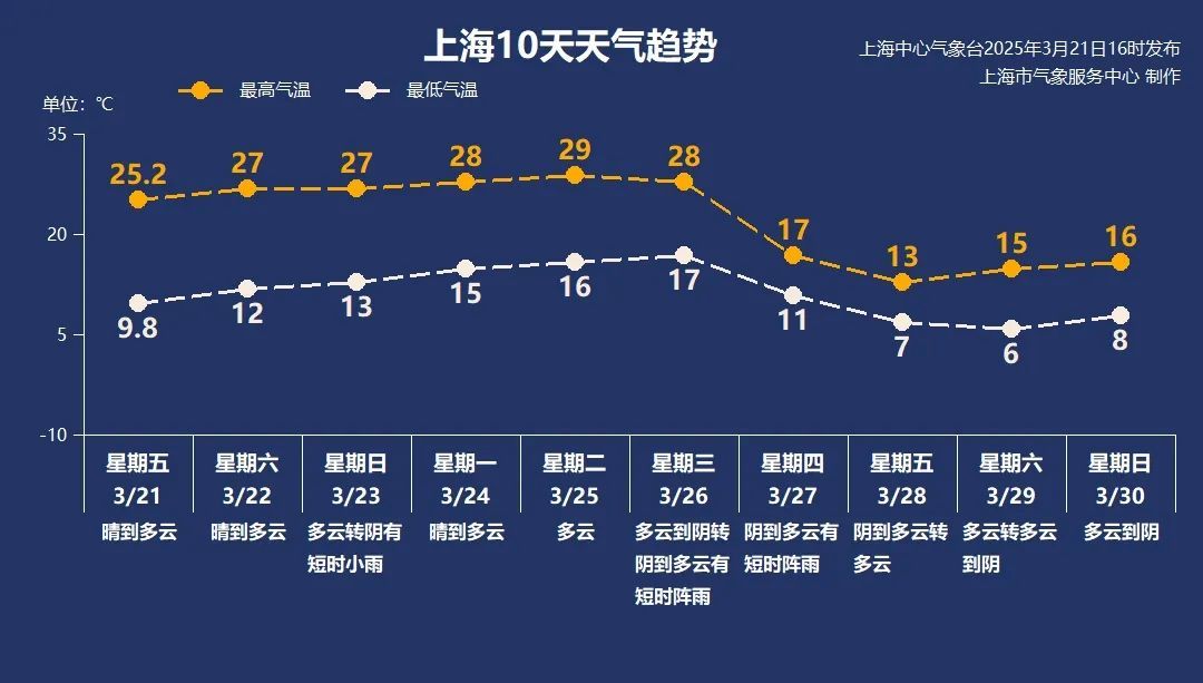 下周初申城依旧是暖意浓浓,天气以晴或多云为主,气温总体在15~29℃。周四前后受冷空气影响,申城将出现一次明显大风、降温和降水过程,由于前期基础温度较高,带来的降温将十分明显,最高气温最大降幅可达15℃左右,初春时节,天气多变,还请大家关注临近预报,及时增减衣物,谨防感冒。