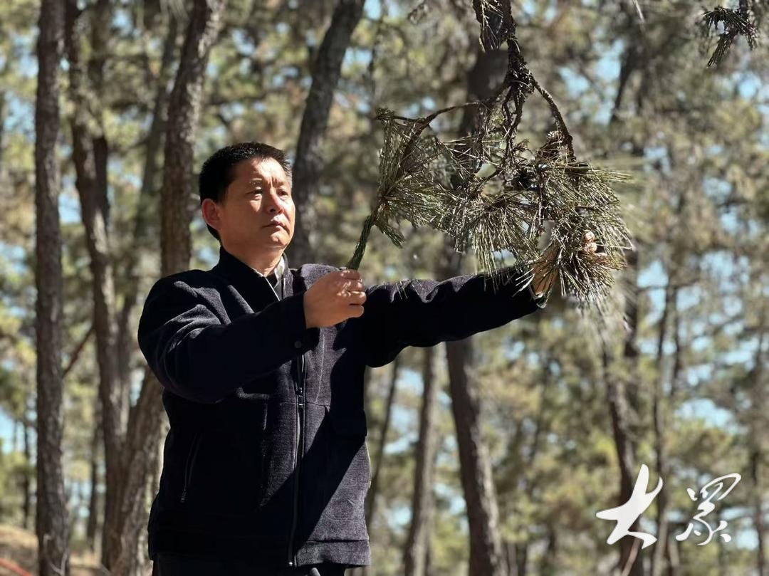 除了森林防火,防治病虫害也是杨西路的一项重要工作。他清楚地记得在2017年3月,巡山时发现管护林区的赤松有点不对劲,枝叶往下垂,树枝里还有不少小虫子。他赶紧上报,后来专家鉴定是日本松干蚧。4月份及时进行了病虫害防治5000亩,有效控制了病虫害的蔓延。“幸亏当时发现得早,否则不知道得损失多少树木。” 提起日本松干蚧,杨西路到现在都心有余悸。