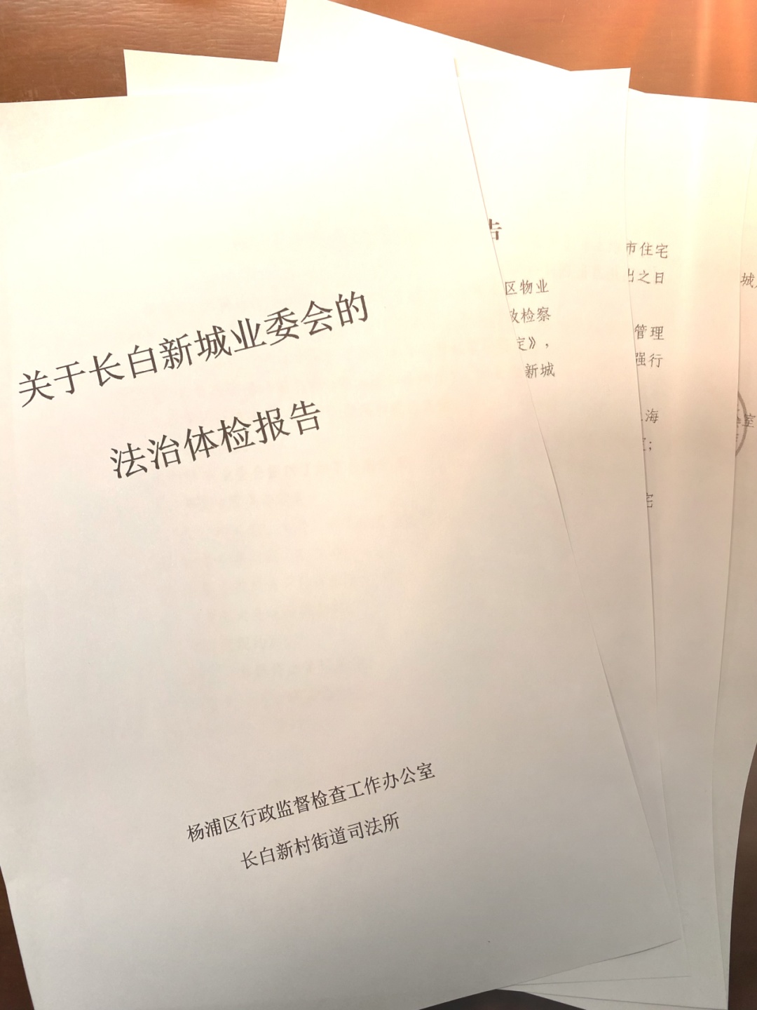 近日,长白新村街道的长白新城业委会收到了一份特殊的体检报告。为加强长白地区业委会规范化建设,实现物业服务质效双升,长白新村街道司法所根据《长白新村街道关于进一步加强党建引领住宅小区物业治理工作实施方案》对辖区业委会开展“法治体检”工作。在经历了前期准备、书面审阅、现场面谈等环节后,第001号法治体检报告已制作完成并送达长白新城业委会。 01 量身定制“体检项目” 前期,司法所与区行政检察监督办、社区法治专员共同组建体检小组,依据《物业管理条例》《上海市住宅物业管理规定》等法规,编制《长白新村街道业委会及物业法治体检清单》。 《清单》包括公约制定、制度执行、合同签订等六大项25小项内容,重点把脉小区“一规两约”、业主大会征询、物业履约等人民群众最为关心的环节,从“有没有”“对不对”“做不做”三方面对业委会运行情况展开分析。 02 对症开具“体检报告” 体检小组根据长白新城业委会提交的材料,通过“书面查阅+实地走访”的方式,多维度掌握小区业委会履职情况和现实中遇到的问题,形成“问题清单+风险预警+法治建议”的“体检报告”。 长白新城业委会主任表示,这份“体检报告”是对他们业委会日常工作的一种鞭策,让他们认识到了工作中存在的短板,为业委会规范化、法治化运行提供了方向。下一步,他们将邀请社区法治专员,结合“体检报告”内容进一步完善自己的工作。 03 常态提升法治效能 《关于长白新城业委会的法治体检报告》的出炉,不仅为长白新城社区治理注入法治动能,更验证了社区法治的“体检式治理”模式可行性。 通过“体检-整改-提升”闭环管理,构建常态化法治指导机制,实现“以检促改、以改促建”,为业委会规范化运作,物业服务企业高效履约提供法治保障。下一步,长白新村街道司法所将紧盯已“体检”完毕的业委会,跟进“体检报告”落实情况,帮助社区提升物业治理能力。