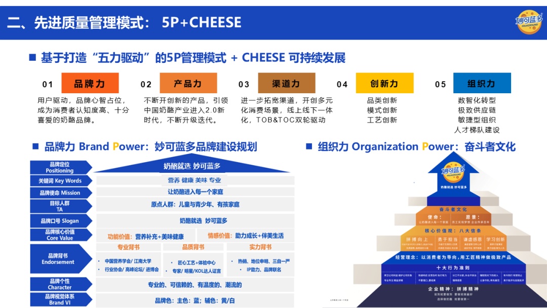 质量管理经验分享:以五大核心驱动力(品牌力、产品力、渠道力、创新力、组织力)为基础,构建“五力驱动”的5P管理模式;制定了“CHEESE”可持续发展的战略,旨在通过六大战路支柱、28大关键议题,推动企业的可持续发展,促进行业向绿色低碳发展道路转型。