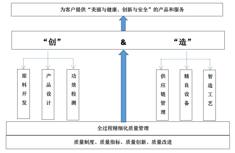 质量管理经验分享:为打造功能护肤品创新研发与智造的工业品牌形象,公司建立“功能护肤品全过程“创”&“造”精细化”质量管理模式,“创”主要体现在:原料开发、产品设计、功效检测等;“造”主要体现在:供应链管理、精良设备、智造工艺等,整个质量管理模式以质量制度、质量指标、质量创新、质量改进为基础,通过人力资源、财务资源、信息资源的输入,顾客和市场的驱动,深度参与功能护肤品市场竞争,不断提升市场竞争力。