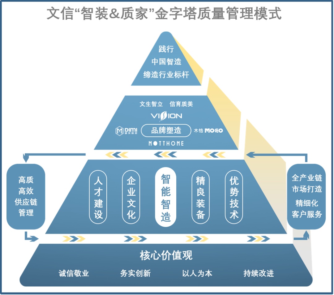 质量管理经验分享:公司坚持“诚信敬业、务实创新、以人为本、持续改进”的核心价值观;重视企业文化建设、引领应用先进装备、积极创新优势技术,聚焦高质高效供应链管理,打造了具有文信特色的“智装&质家”的智能智造管理模式。在深耕家具行业全产业链市场打造、提供精细化顾客服务的同时,努力实现公司成为“行业标杆引领”的愿景。