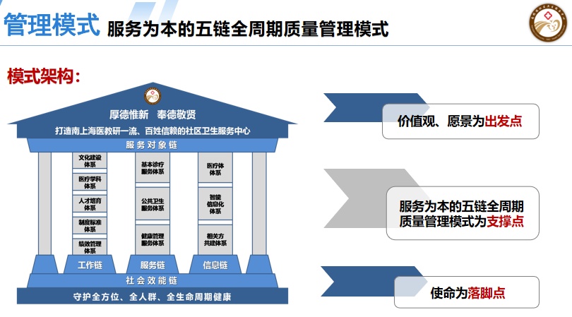 质量管理经验分享:中心以“守护全方位、全人群、全生命周期健康”使命为责任,以“打造南上海医教研一流、百姓信赖的社区卫生服务中心”愿景为引领,“厚德惟新、奉德敬贤”价值观为核心,形成了“服务为本的五链全周期质量管理模式”。以“服务对象链”为驱动和目标,推动工作链、人才链、信息链管理体系的完善和创新,实现服务患者和居民健康的战略目标和社会效能,打造健康服务的“南卫样板”。