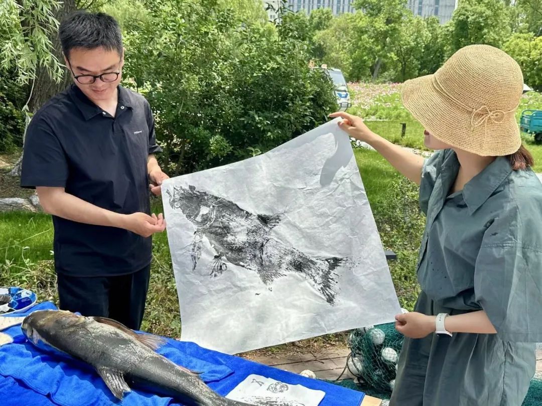 岸上的同学不仅在加油助威,也饶有兴致地体验传统非遗技艺——鱼拓。大家挑选出心仪的小鱼,先在鱼身上涂颜料进行渐变处理,再用纸张拓印,动手绘制鱼眼,以使画面更具灵动性。