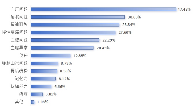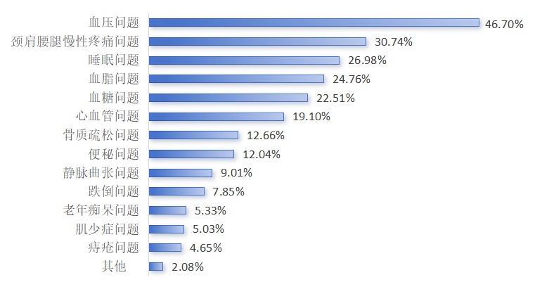 在预防/改善疾病诉求方面:长者运动健康之家锻炼的老年人多希望通过运动有助预防/改善血压问题(46.70%)、颈肩腰腿慢性疼痛问题(30.74%)、睡眠问题(26.98%)、血脂问题(24.76%)等。