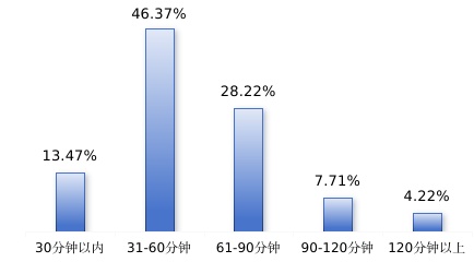 长者运动健康之家锻炼的老年人中,大多数每次的锻炼时长超过30分钟。
