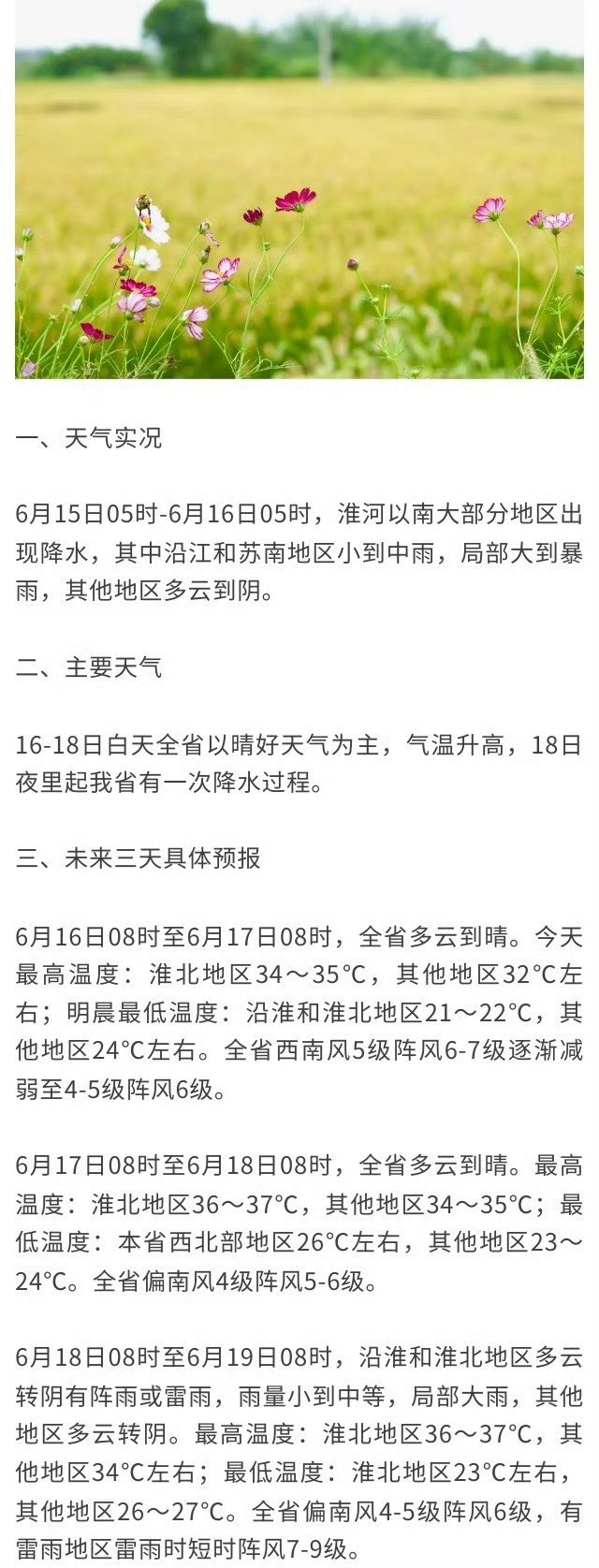 6—18日白天全省以晴好天气为主,气温升高,18日夜里起我省有一次降水过程。6月16日08时至6月17日08时,全省多云到晴。今天最高温度:淮北地区34~35℃,其他地区32℃左右;明晨最低温度:沿淮和淮北地区21~22℃,其他地区24℃左右。全省西南风5级阵风6-7级逐渐减弱至4-5级阵风6级。