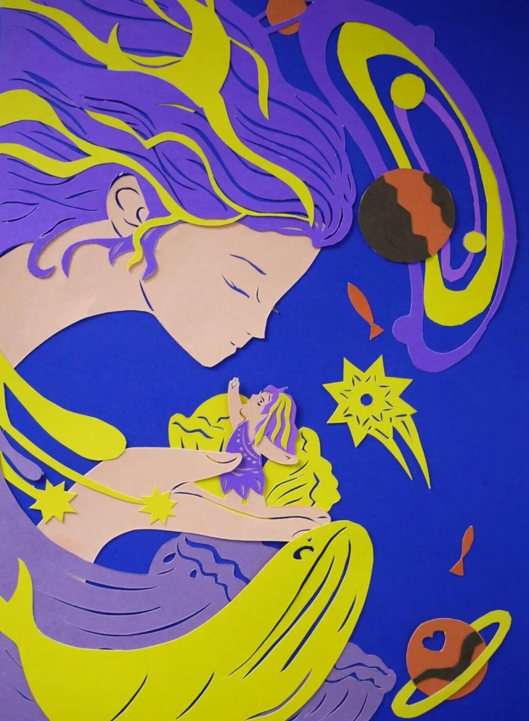 民警将“母亲文化”主题创作作为重要的矫治契机,主动引导李某参与其中,并鼓励她阅读母亲寄来的信件,希望能促成母女关系的破冰。当李某终于鼓起勇气翻开信件,母亲的字句让她百感交集,也成为了她创作的灵感源泉。她将这份情感投射于作品《托举》:在绚丽的星河下,一位母亲将孩子高高托起,精致的镂空刻法生动刻画出孩童的形态,淋漓尽致地表达了“你是我捧在手心的全世界”的深沉爱意。