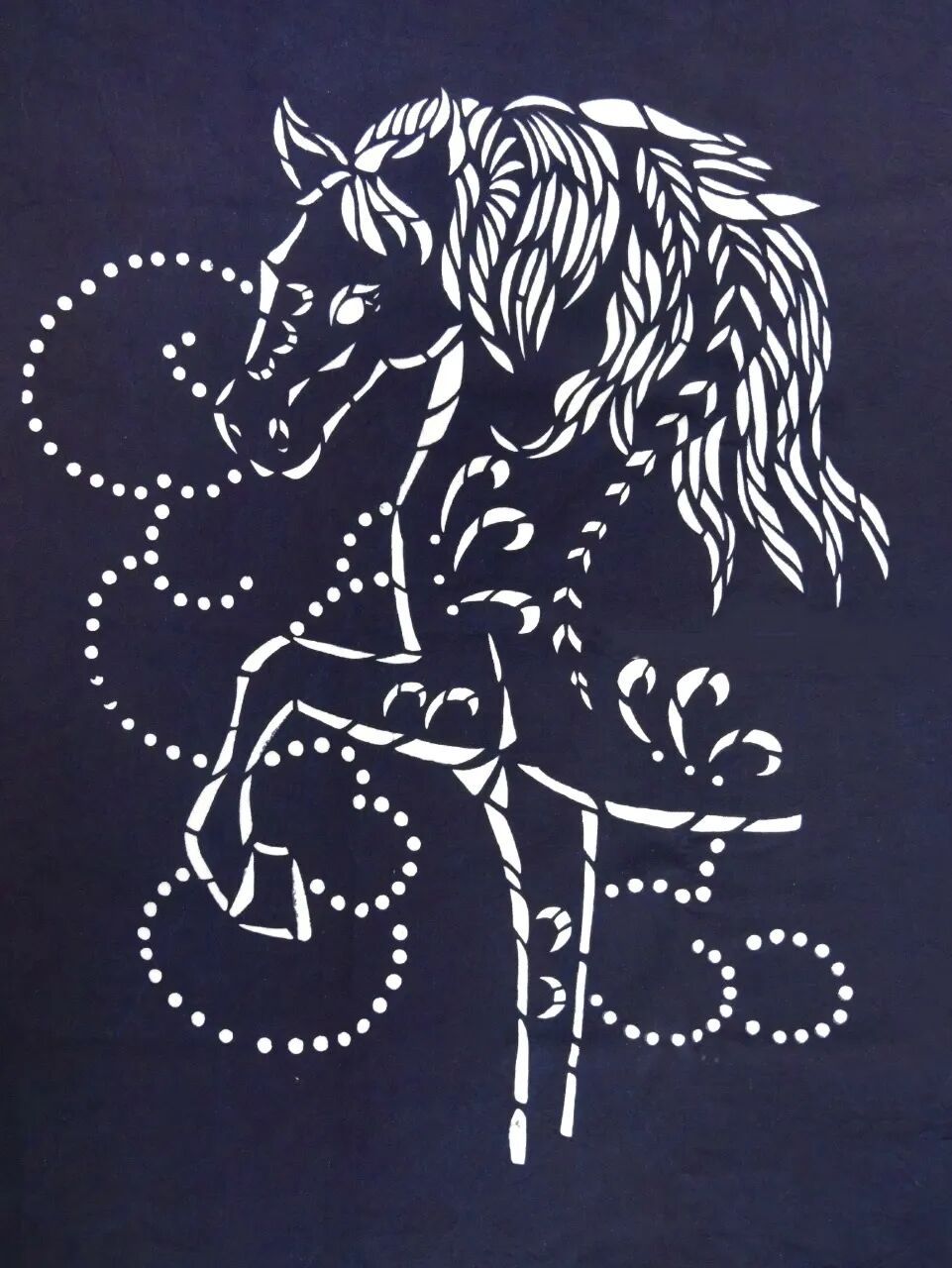 引导罪犯以刻好的剪纸图案为防染模板,经过刮浆、浸染等传统工序,最终创作出以“马”为主题的一系列药斑布作品。这些作品既承载着非遗厚重的历史底蕴,也闪耀着服刑人员走向新生的艺术光芒。