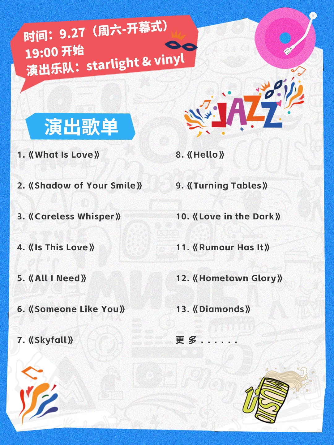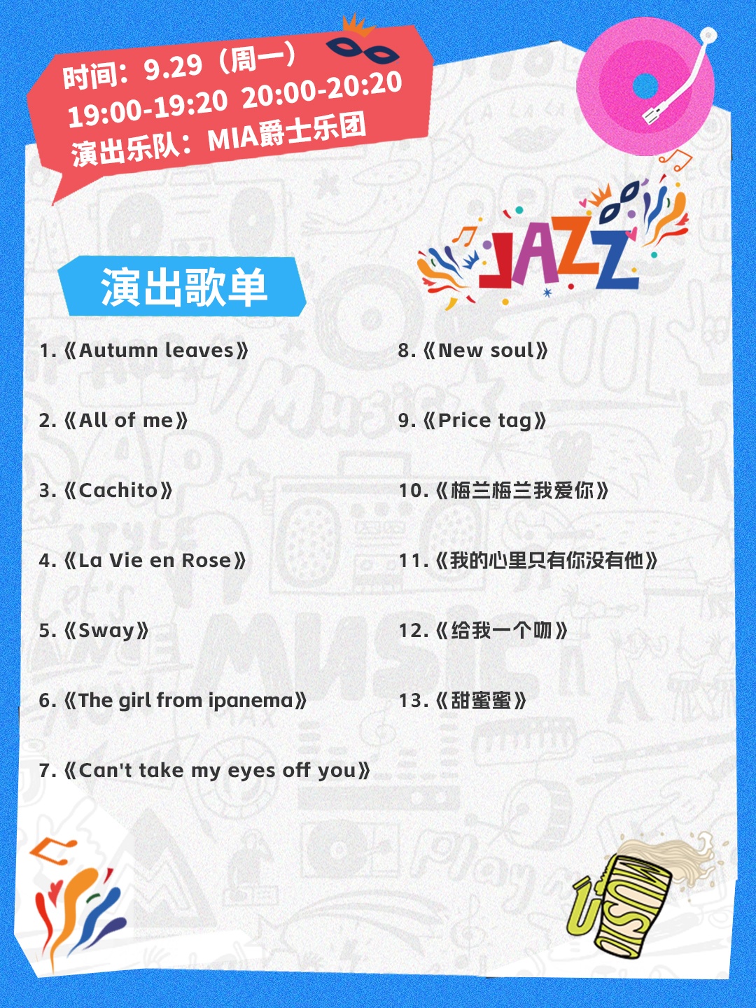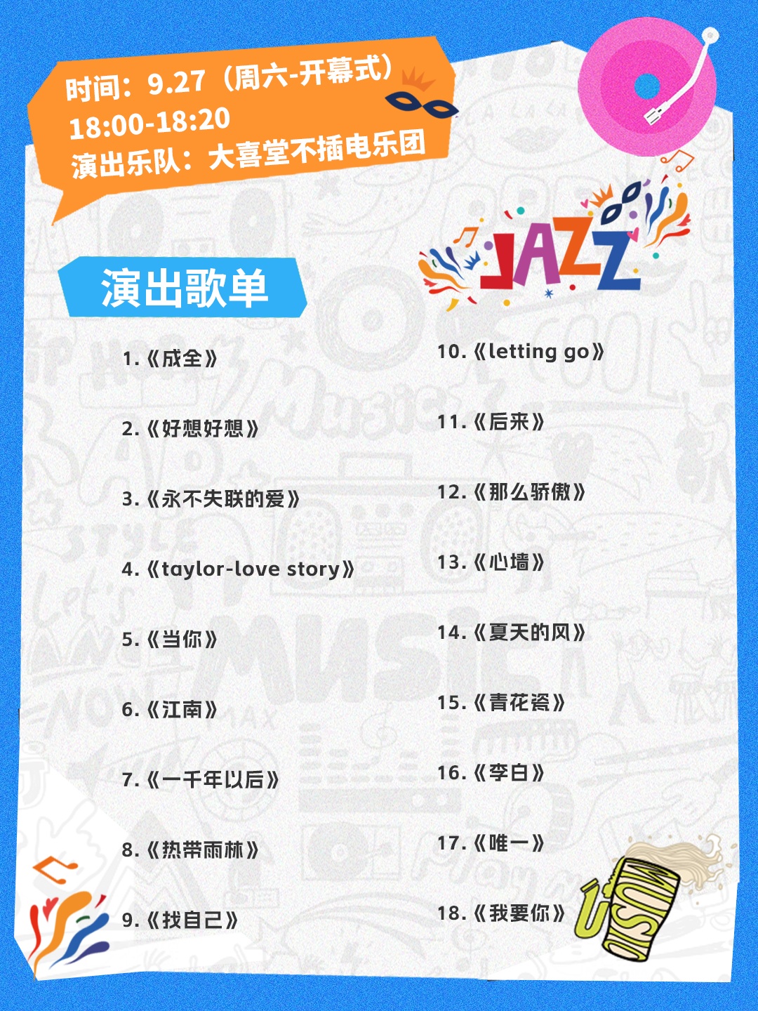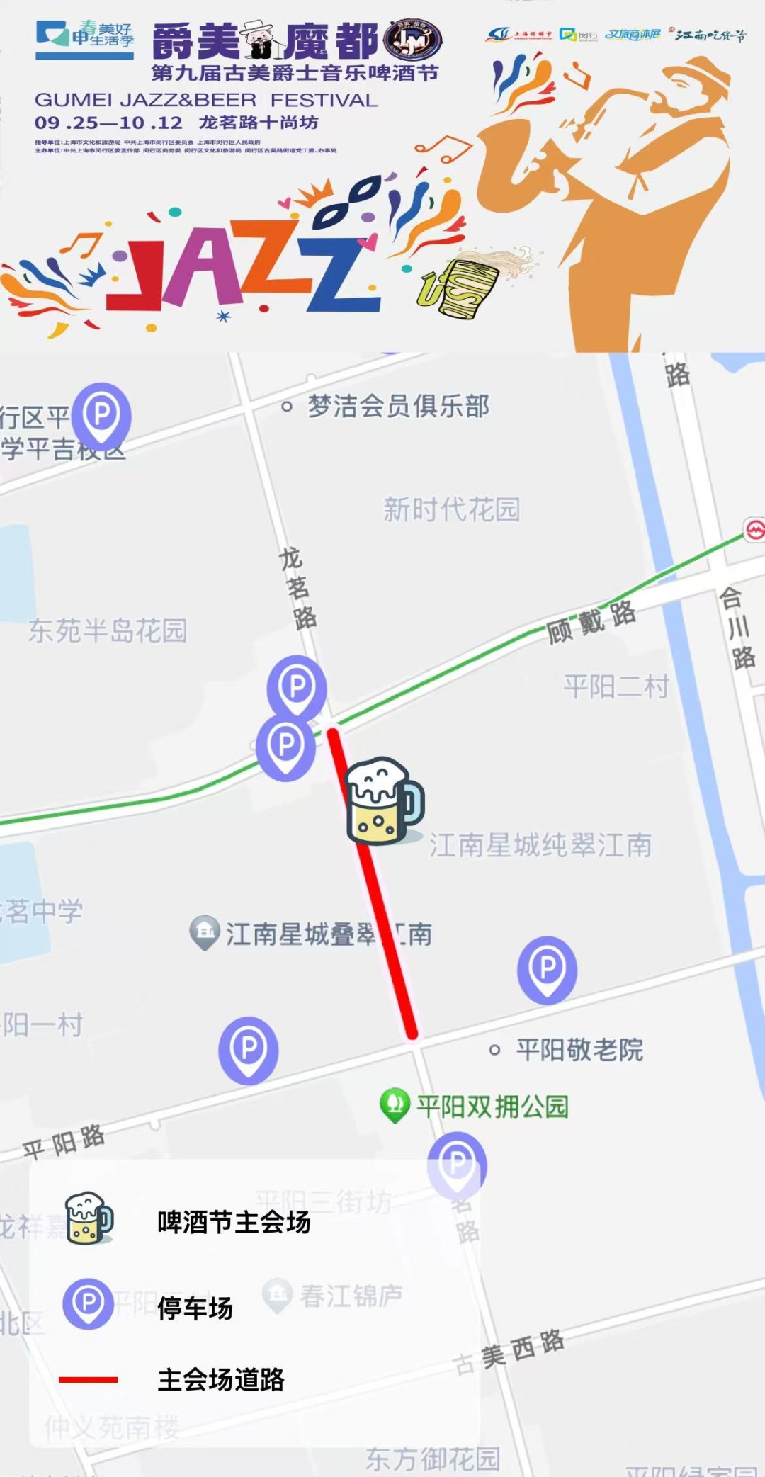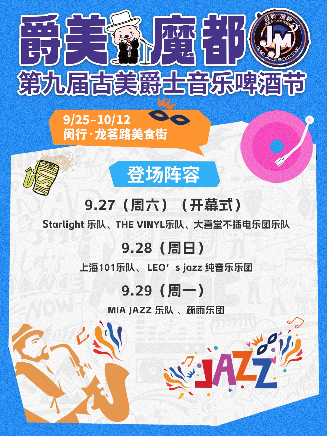 准备好迎接这场 超酷的潮流狂欢了吗? 就在今晚! 爵士、冰啤、电影……古美秋夜腔调拉满!即日起至10月12日,春申美好生活季重要活动江南吃货节之“爵美·魔都”第九届古美爵士音乐啤酒节火热开启!来这里,不只能品尝江南好味道、闵行本地特色美食,还有精彩舞台演出~更能喝着啤酒看老片,适适意意过国庆! 9月27日起 舞台连嗨16天! 中秋团圆饭、国庆小长假 全程接档不停歇~ 魔都潮人早已锁定龙茗路十尚坊 现在为大家解锁节目清单 快来看看有啥好白相! 01 开幕式嗨爆3夜 9月27日—9月29日 3晚阵容速览! 安排好你的时间 快来轧闹猛~ *具体演出歌单、表演时间以现场为准 9月27日 开幕式 19:00 THE VINYL×Starlight 双阵容打头阵 中段穿插IP发布、颁奖、 达人独唱、爵士舞 再接两轮啤酒互动 氛围感拉到满格~ Starlight 演出地点:主舞台 演出时间:19:00开始 一支来自乌克兰、哥伦比亚的Jass Starlight混合乐队,常年专注于/爵士/蓝调风格的音乐演唱。先后参加九门国际爵士音乐周,广州爵士音乐节,台湖爵士音乐节,苏州蒙特勒(中国)爵士音乐节。 THE VINYL 演出地点:主舞台 演出时间:19:00开始 “维林”乐队,这是一支能将您带入充满活力的20年代,并融入现代元素的乐队。乐队的音乐风格融合了蓝调、爵士和现代流行旋律,并经过重新编排,以爵士风格呈现,能让您整晚都保持活跃状态。 *具体演出歌单以现场为准 大喜堂不插电乐团 演出地点:小舞台 演出时间:18:00—18:20 大喜堂乐团由鼓手大喜哥以及多名职业乐手组成的乐队。乐队以其清新文艺又不失律动的曲风和现场表现力深受年轻群体喜爱。 *具体演出歌单、表演时间以现场为准 9月28日(周日) 上海101乐队×LEO’s jazz 乐队 一明一暗两种味道 听感很丝滑。 上海101乐队 演出地点:主舞台 演出时间:19:00—19:20 20:00—20:20 乐队已携手走过逾千场大小音乐舞台:各类音乐节、主题派对、潮牌活动等。十余年来为沪上大小舞台提供了无数海派影像。 *具体演出歌单、表演时间以现场为准 Leo's Jazz乐队 演出地点:小舞台 演出时间:18:30—18:50 19:30—19:50 实力派纯器乐爵士班底,以硬核演奏技巧重塑现场标准。具有丰富的音乐舞台经验,为大家营造沉浸式的听觉体验。 *具体演出歌单、表演时间以现场为准 9月29日 (周一) MIA JAZZ 乐队×疏雨乐团 专业派镇场 适合坐定细细品。 MIA 爵士乐团 演出地点:主舞台 演出时间:19:00—19:20 20:00—20:20 一支现代感的,集爵士、融合、流行、古典为一体的精湛乐队。成员都毕业于音乐学院,在各自领域都有着杰出成绩。 *具体演出歌单、表演时间以现场为准 疏雨乐团 演出地点:小舞台 演出时间:18:30—18:50 19:30—19:50 原声小班底,于细腻处见真章。专注于挖掘原声音色本身的温暖与动态,如同精工细作的匠人,在留白与律动之间勾勒出深邃的音乐空间。 *具体演出歌单、表演时间以现场为准 02 乐队“神仙打架”剧透 9月30日至10月5日 假期超长待机 主舞台、小舞台不重样 音乐加码,狂欢升级! *具体演出歌单、表演时间以现场为准 图腾乐队、FLY乐队、 启点乐队、撞音乐队、 Moon light band乐队、 Bingo Jennifer乐队…… 更多神秘乐队加入 豪华阵容持续曝光! 还有社区达人卡拉OK! 赶紧去爵士文化广场秀一把 现场“K歌之王”就是侬啦~ 03 露天电影院·节日片单 10月6日到12日 露天电影周 主舞台变身影院 (左右滑动,查看更多) 片子类型覆盖 亲子/冒险/动作/剧情 连看7天不重样 边吃边看真带劲 *具体片单与时段以现场公告为准 要轧闹猛来十尚坊 古美爵士音乐啤酒节 一起喝啤酒、吃美食、看舞台吧~ 停车指引: 9月25日至10月12日期间 平阳路、平吉路 临停车位开放时间: 17:30—23:00 (扫描二维码查看停车区域)