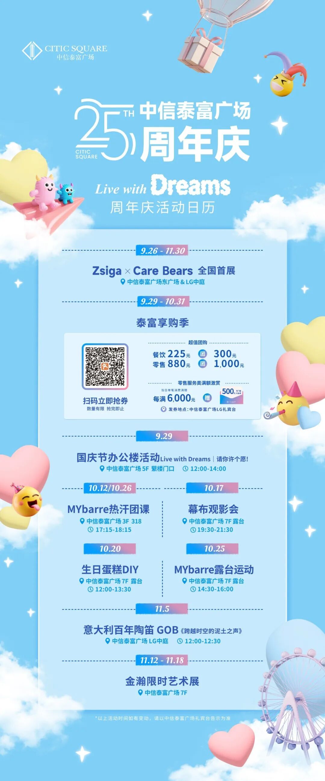 9月26日,中信泰富广场25周年庆正式启幕,在“Live with Dreams”主题下,一场潮流融汇的盛宴在此上演——POP MART旗下高人气原创IP形象Zsiga联动全球潮流ICON Care Bears,在中信泰富广场举办Zsiga × Care Bears全国首展,“浮云梦屿”发出限时召集令,即将打开“现实版寻梦环游记”;周年庆期间,商场入驻品牌纷纷蓄势待发,巧妙融合跨界灵感,碰撞出多元体验,共赴一场美学盛宴。