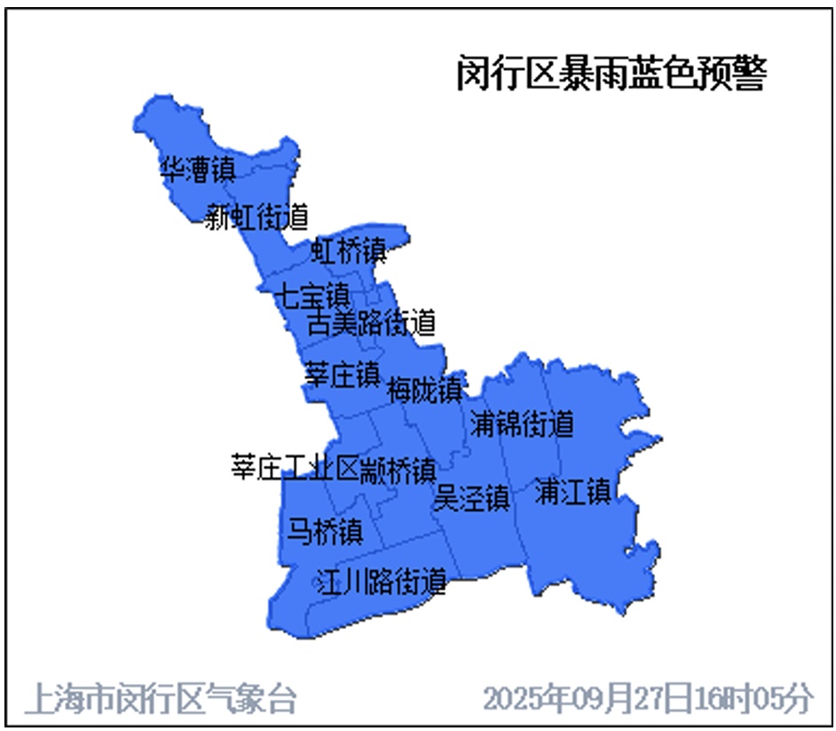 闵行预警发布中心2025年9月27日16时05分发布暴雨蓝色预警信号:预计未来6小时内,本区大部街镇(莘庄工业区)将出现一小时雨量35毫米以上的短时强降水天气,请注意防范强降雨可能引发的城市积涝,并做好低洼、易受淹地区排水防涝工作。