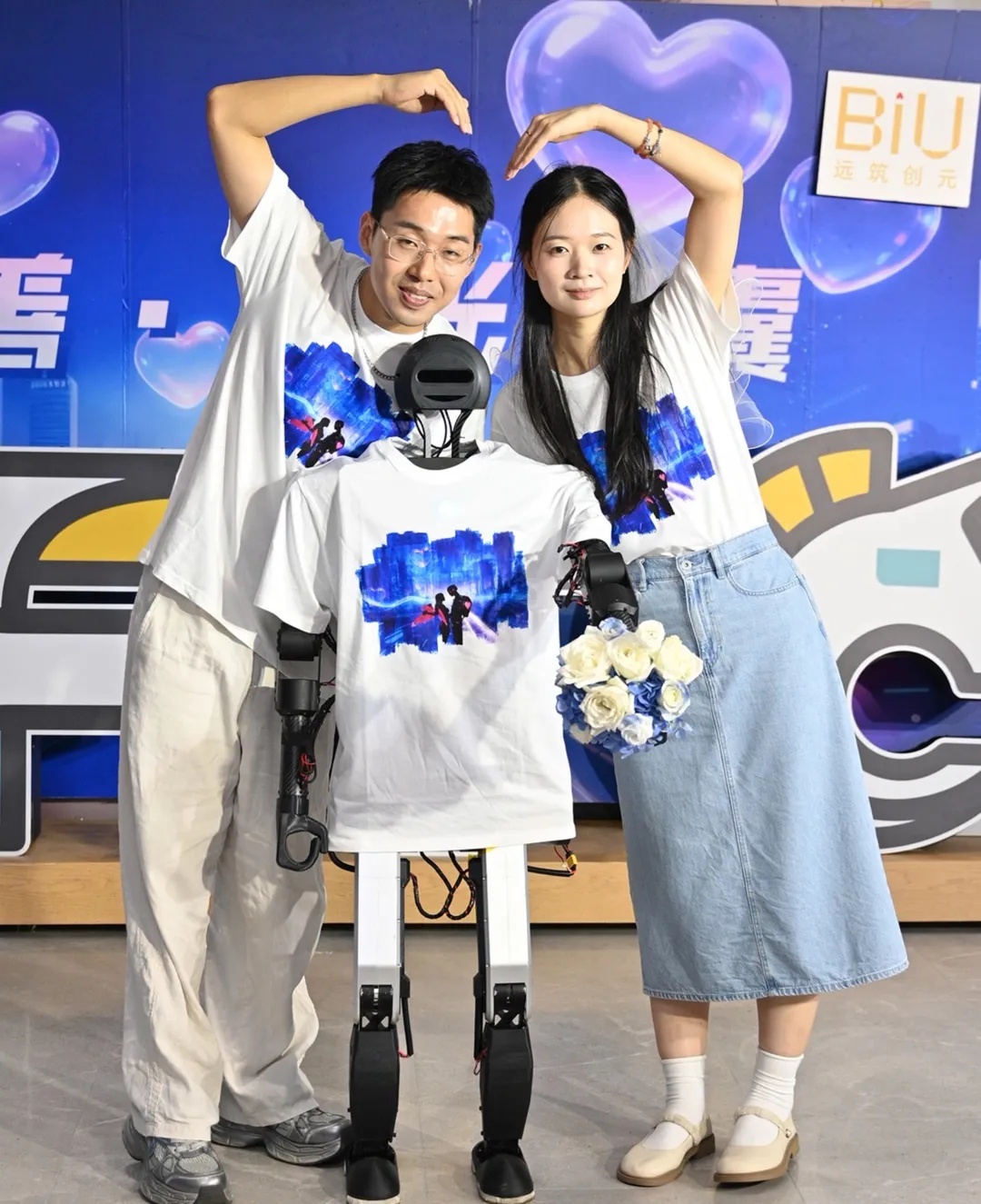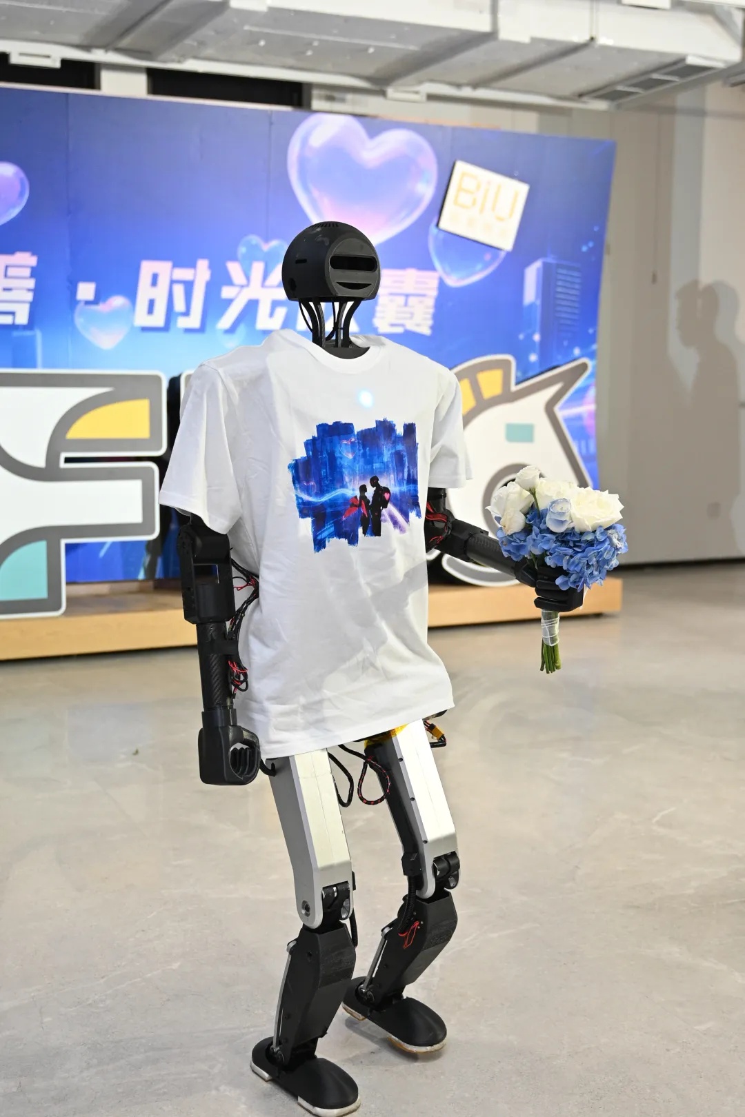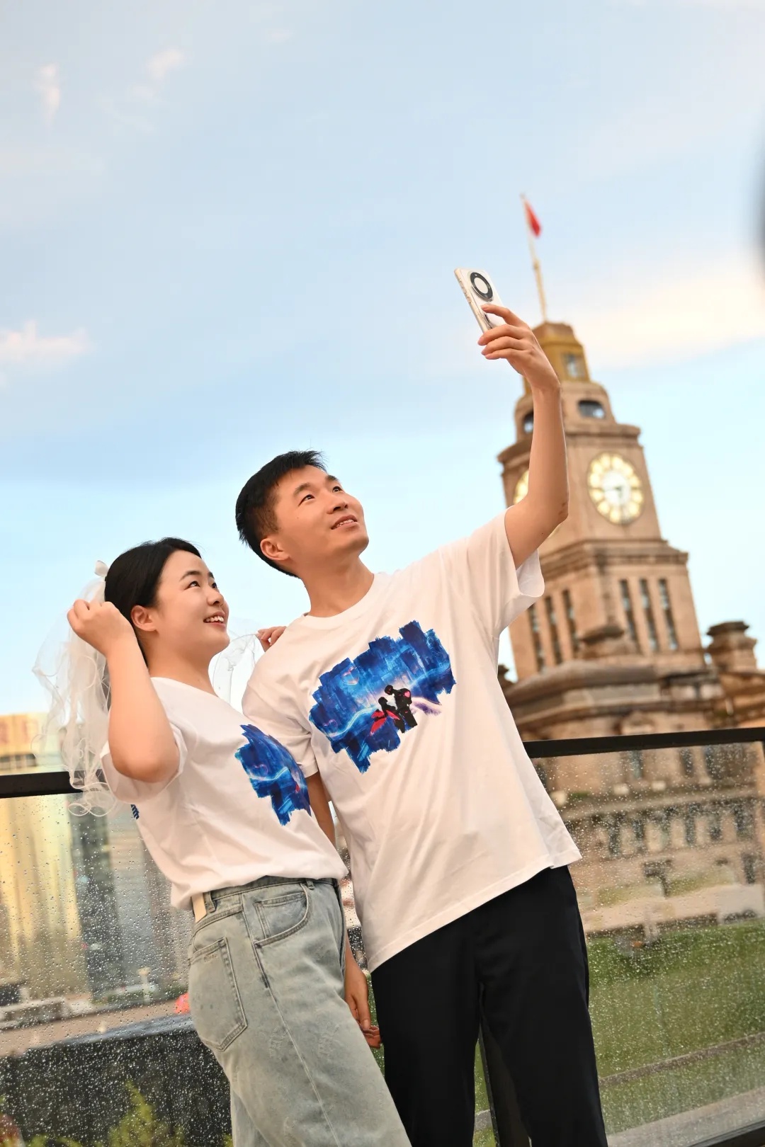 黄浦区的科创新人们在现场也体验了科技赋能爱情的甜蜜。人形机器人递证书、AI生成“50年后金婚影像”、VR时间胶囊封存幸福瞬间……科创元素贯穿全程,让誓言不仅被听见,更被科技温柔收藏。