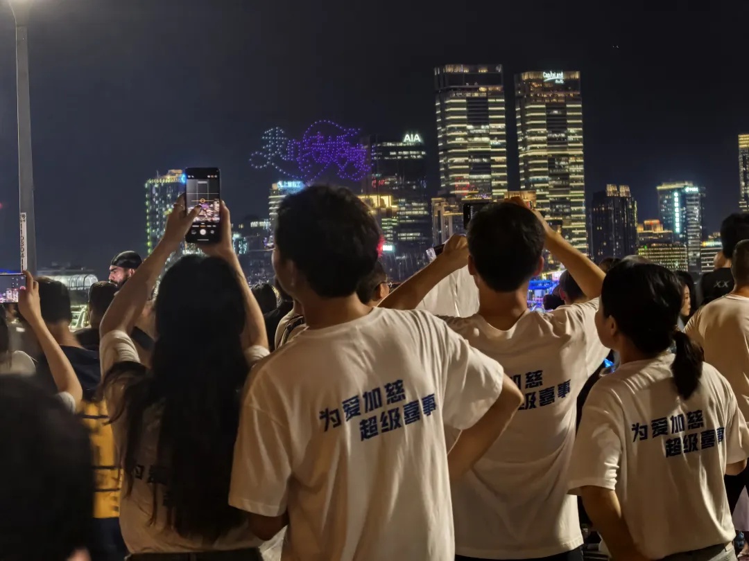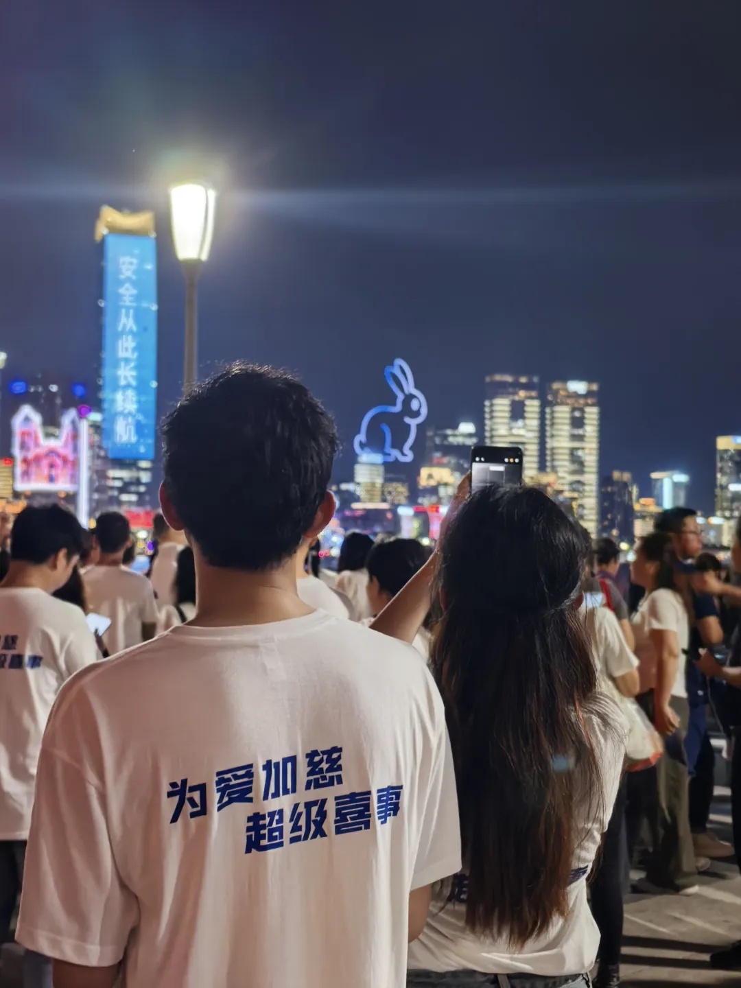 当夜幕降临,新人与嘉宾共同欣赏“申情海誓,爱在黄浦”无人机飞行表演。璀璨灯光在夜空中绘就爱的誓言,为这场“为爱加慈”的超级喜事画下圆满句点。