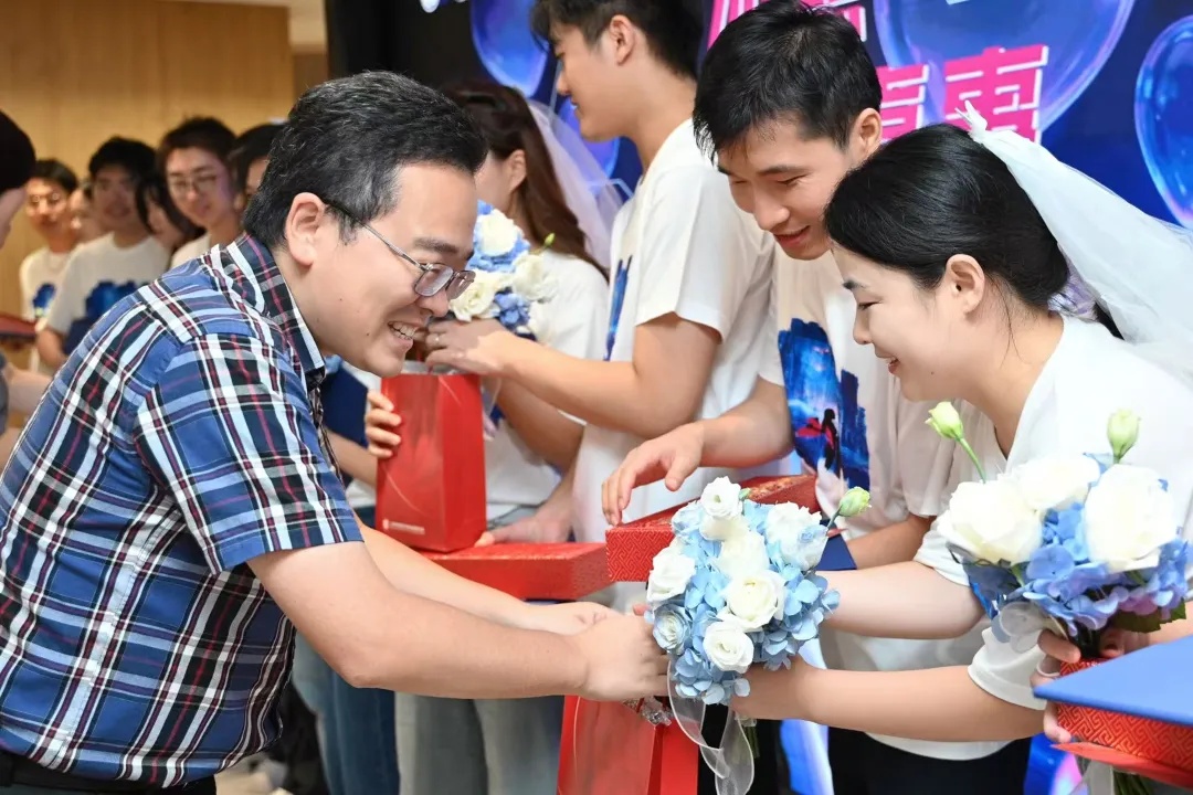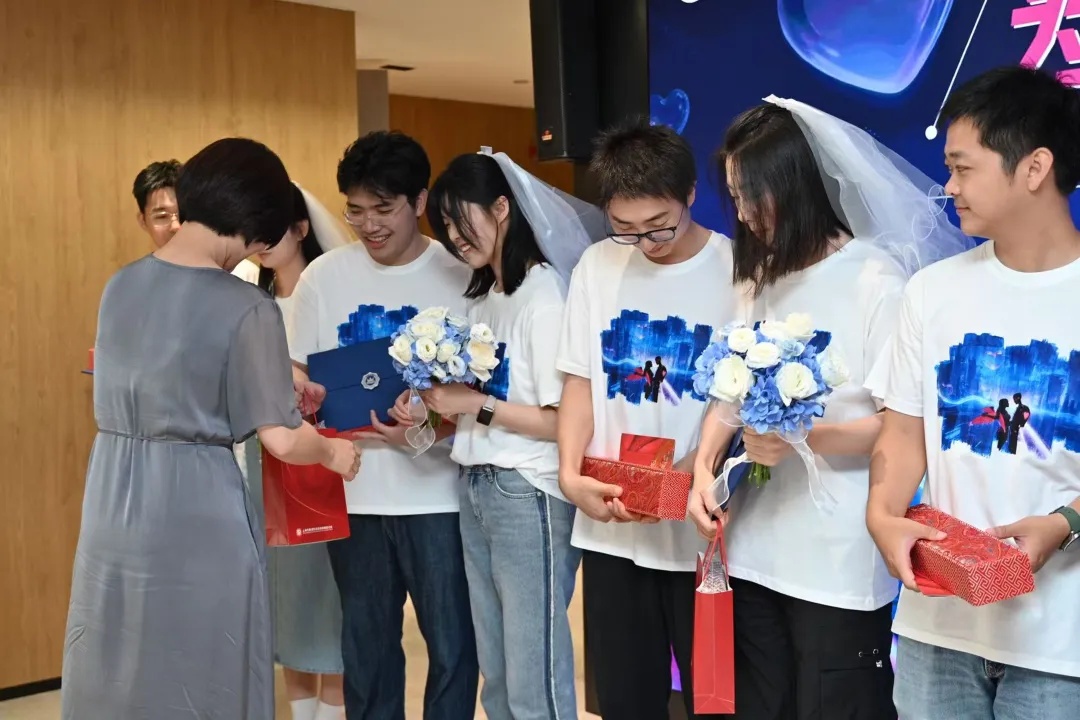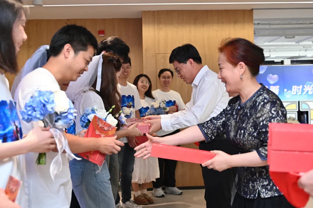 活动中,领导嘉宾共同为新人送上婚书并为新人证婚,见证新人郑重许下誓言,还为新人送上甜蜜礼包,寓意婚姻生活甜美圆满。特殊的爱情声波纹证书交至新人手中,展现出“科技+浪漫”的独特仪式感。