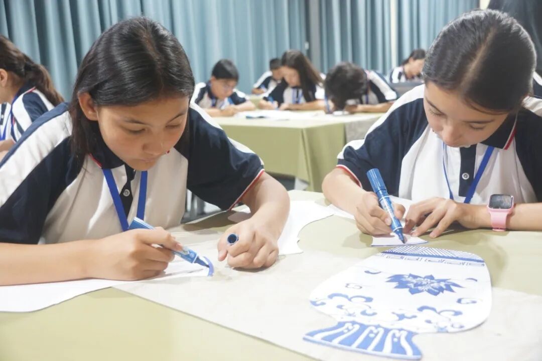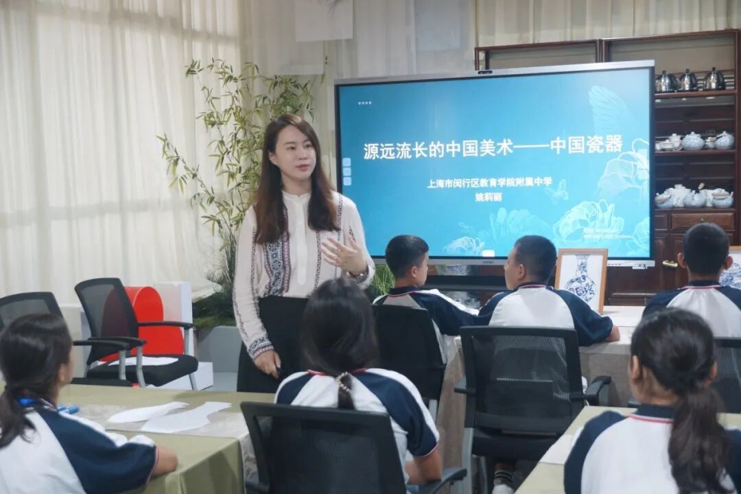 另一边,闵教院附中副校长姚莉丽开展了“源远流长的中国美术——中国瓷器”美术创作体验课,从瓷器的器型演变、纹饰寓意到背后的文化内涵,层层深入讲解,还带领学生尝试开展创作,让学生在动手实践中感受传统艺术之美。