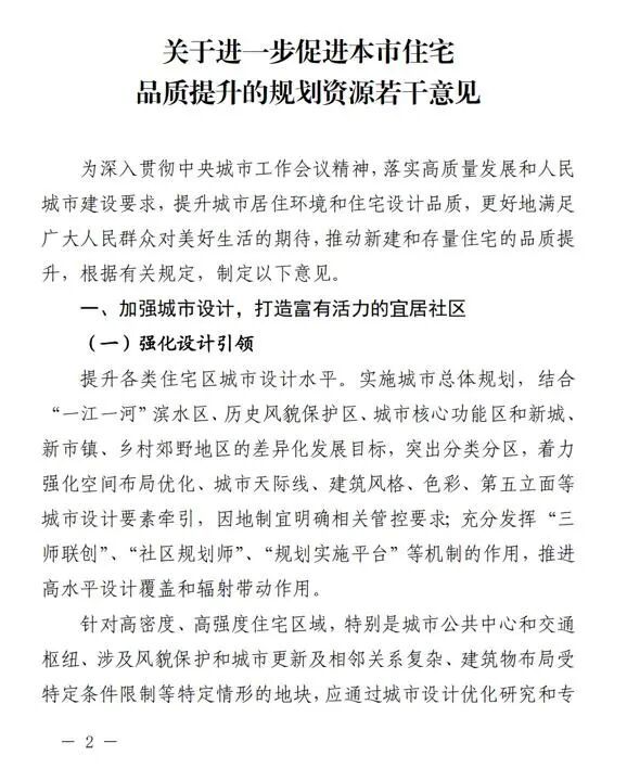 《关于进一步促进本市住宅品质提升的规划资源若干意见》已于近日出台。