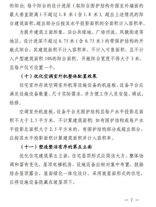 此次新规提出的阳台设计变化最大。同时符合以下条件的阳台(含封闭阳台),面积按其水平投影面积的1/2计入容积率:每户阳台水平投影总面积不大于该户型建筑面积的10%,且不大于16平方米(含16平方米),户型建筑面积小于80平方米的,可以设置总面积不大于8平方米的阳台;每个阳台的设计进深(取阳台围护结构外围至外墙面的最大垂直距离)不超过1.8米(含1.8米)。