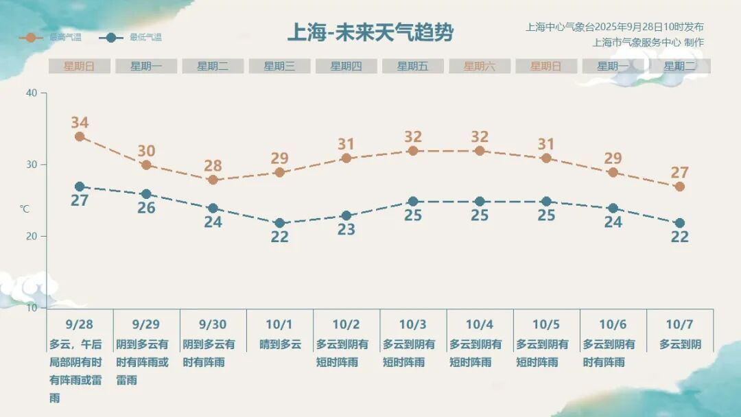 明后天上海云系更多,降水也更为明显。雨水频繁加上节前交通繁忙,出行请注意安全。北风和雨水双重打压下,气温终于降至30℃以下。国庆节当天上海天气晴好,气温也比较适中。10月2日到6日期间云系较多,有些小范围的短时阵雨,气温在23℃-32℃之间,较常年偏高。