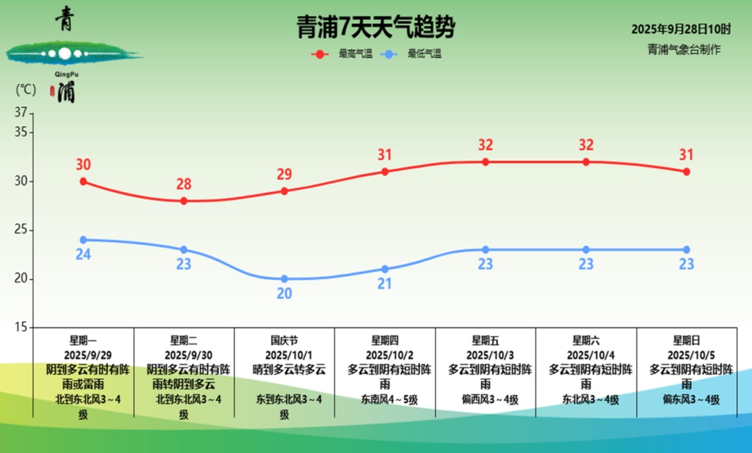 今天青浦依旧是多云为主,午后局部地区阴有时有阵雨或雷雨的天气。预计今天最高气温仍可达34-35℃。偏西风,傍晚转偏北风,风力3-4级。相对湿度95%-55%。潮湿闷热体感难消,大家适当防暑降温,出门带好雨具。 下周初副高的势力收缩,气温有所下降。其中周一(9月29日)前后将有一次较为明显的降水过程,遇雨水和北风打压,周二的最高气温可跌至28℃以下。不过副高撤退不是一蹴而就,此后气温仍有小幅反弹,最高气温再升回30℃以上。国庆当天多云为主,假期中期云多伴阵雨。