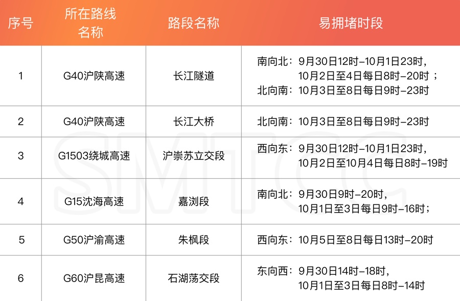 车多易堵。G40沪陕高速长江隧道段(南向北)与G1503绕城高速沪崇苏立交段(西向东)的易拥堵时间段,从9月30日12时出现后,将持续至10月1日23时,持续时长达35小时。