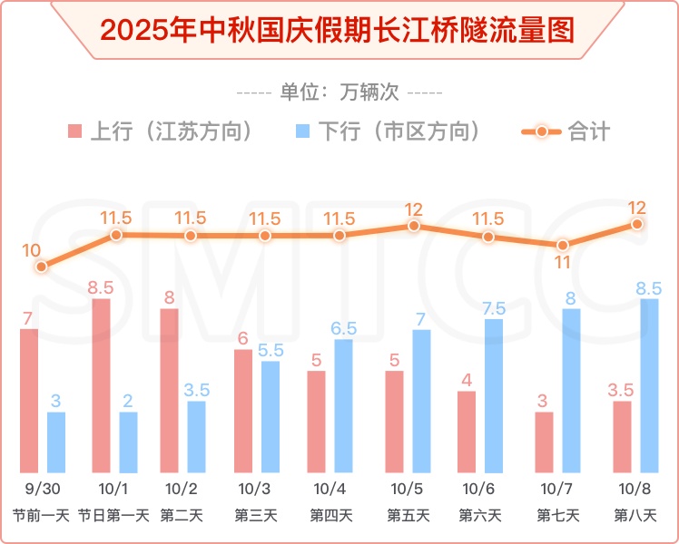 这份出行指南信息显示,中秋国庆假期,上海高速公路日均流量将达161万辆次至166万辆次,同比增长在3%以内。备受关注的G40沪陕高速长江隧道,日均流量达11.6万辆次/日,同比增长约5%。其中上行(江苏方向)5.4万辆次,下行(市区方向)6.2万辆次。