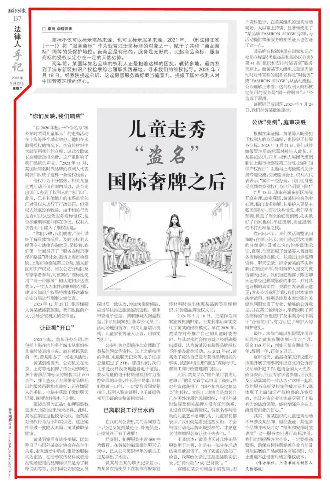 “自2020年起,一个命名为‘国外某时装周儿童单元’的走秀活动在上海等多个城市举办。他们在未取得授权的情况下,在宣传材料中大肆使用我们的商标,以此收取家长高额活动报名费。这严重影响了我们品牌的声誉。”2023年11月,某国际知名时尚品牌的权利人代表向我们反映了这样一条侵权线索。