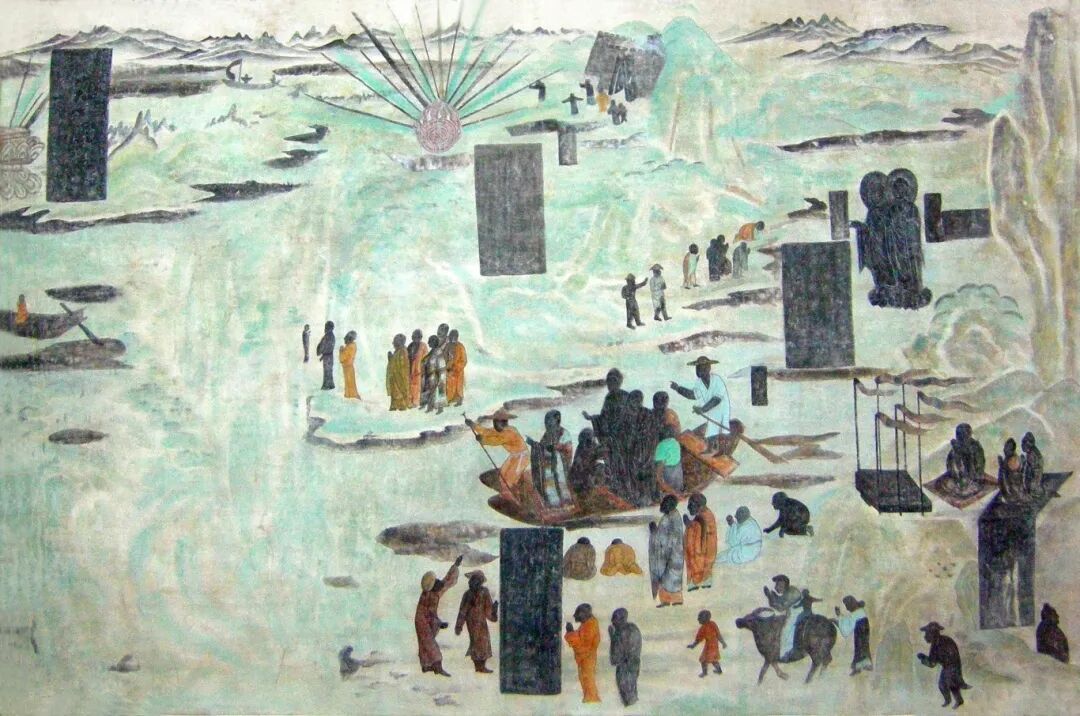 敦煌莫高窟第323窟,有这样一幅精美的壁画和一个神奇而美丽的故事。所绘场景为西晋时“维卫”“迦叶”二石佛漂入沪渎的故事。