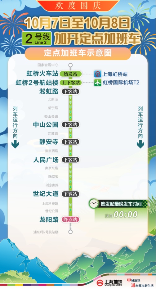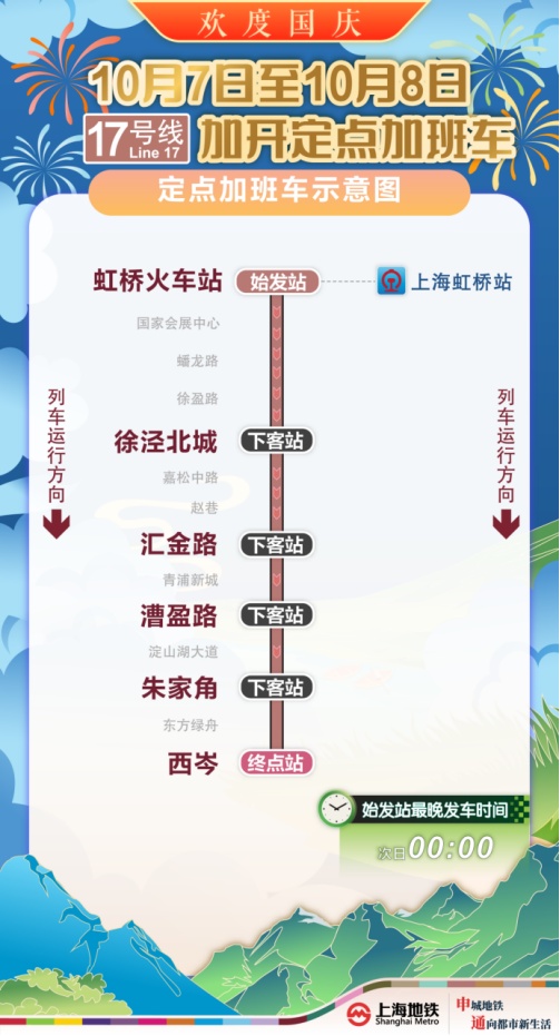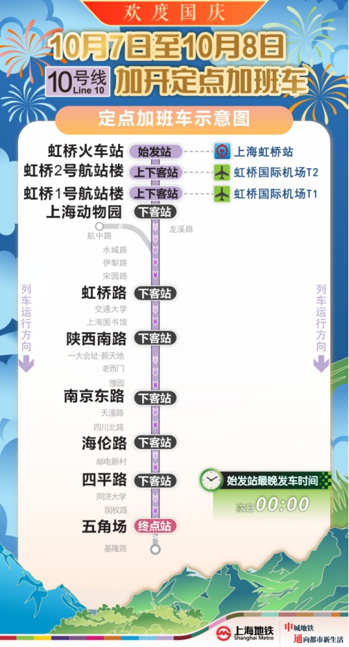 为提升国庆返程期间重要交通枢纽夜间疏散能力,根据计划,10月7日至10月8日,地铁1、2、10、17号线也将加开定点加班车,末班车发车时间延长至次日0点。同时,地铁运营方还将密切关注虹桥枢纽夜间客流情况,根据现场客流需求或将进一步延长定点加班车开行时间。