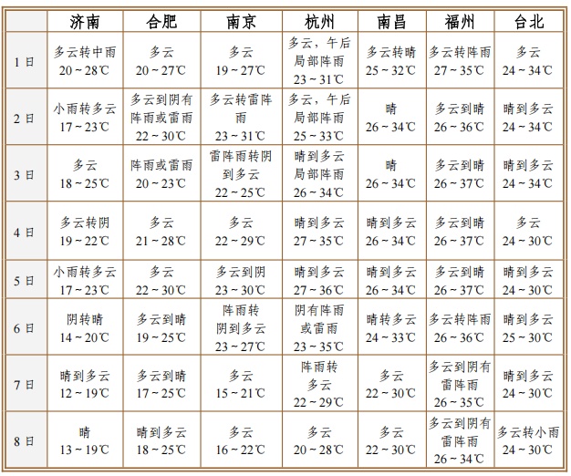 气温:假日气温先升后降,总体比常年同期偏高,平均气温约26℃,最高气温出现在3-6日(32℃-33℃),7-8日受冷空气影响,最高气温回落至27℃-28℃,降温幅度4℃-6℃。