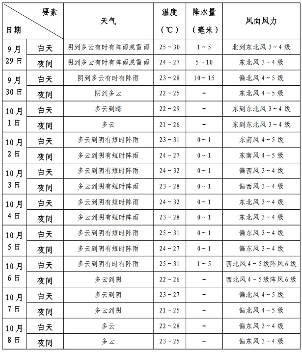 2.未来十天,南海及西北太平洋还将有1-2个台风生成;10月4日后,可能有台风生成并向东南部海域和沿海地区靠近。请前往相关地区的市民,及时关注天气变化、注意安全。