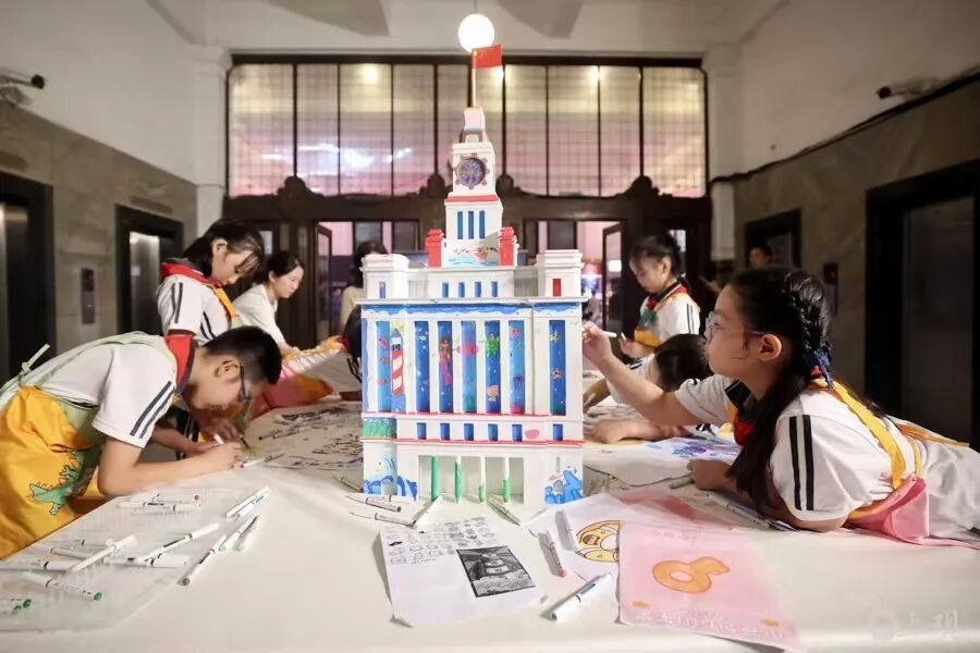在海关大楼钟声的伴随下,建筑修缮专家宿新宝与大提琴演奏家张诗意以陈丹燕的“外滩三部曲”为线索,呈现了一场融汇建筑、文学与音乐的深度对话,诠释出“让建筑被阅读,让时间被聆听”的策展理念。来自报童小学的6名小学生在海关大楼白色模型上即兴涂鸦,以童心童趣对话历史沉淀,寓意着城市未来发展的无限可能。